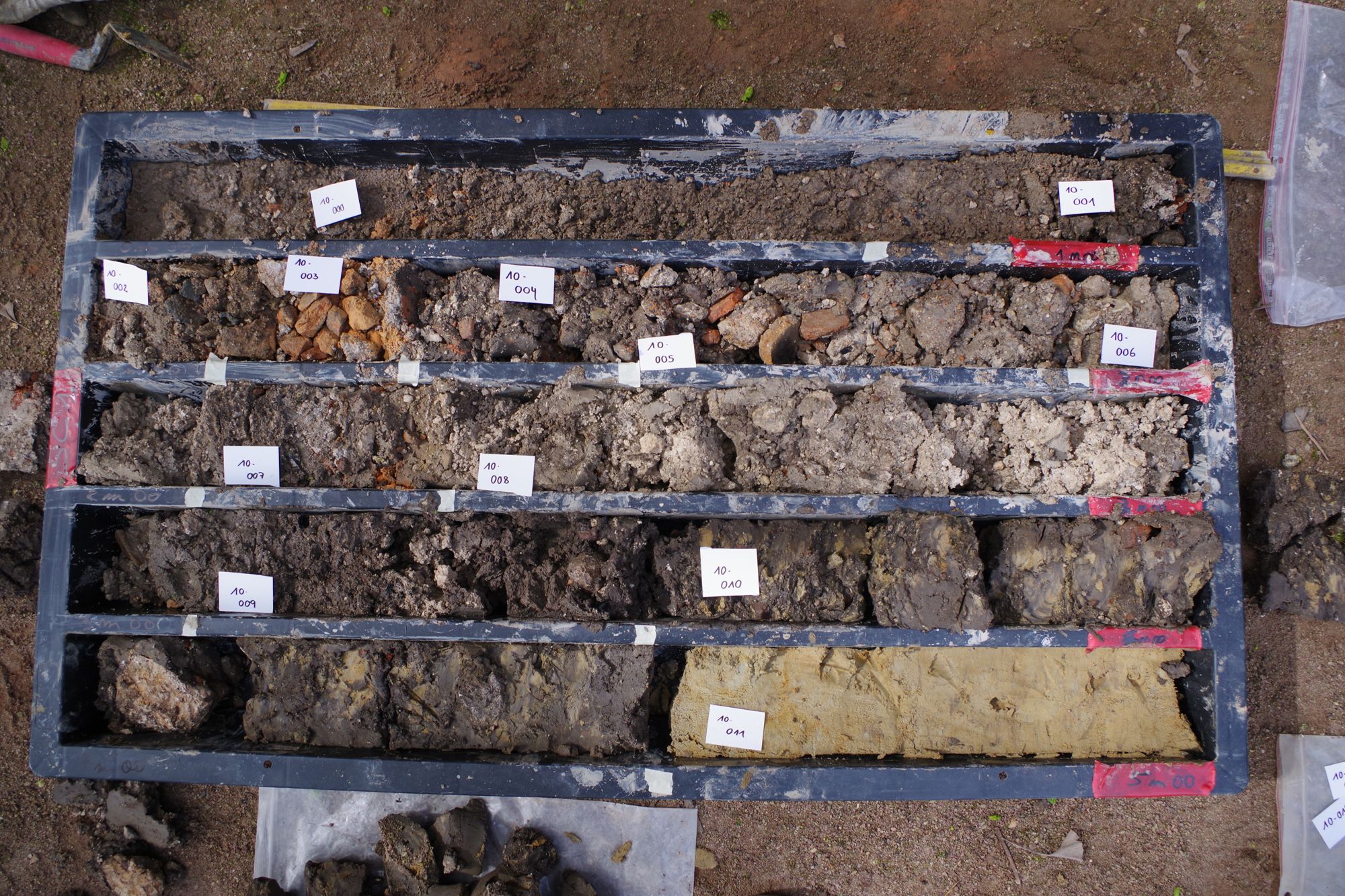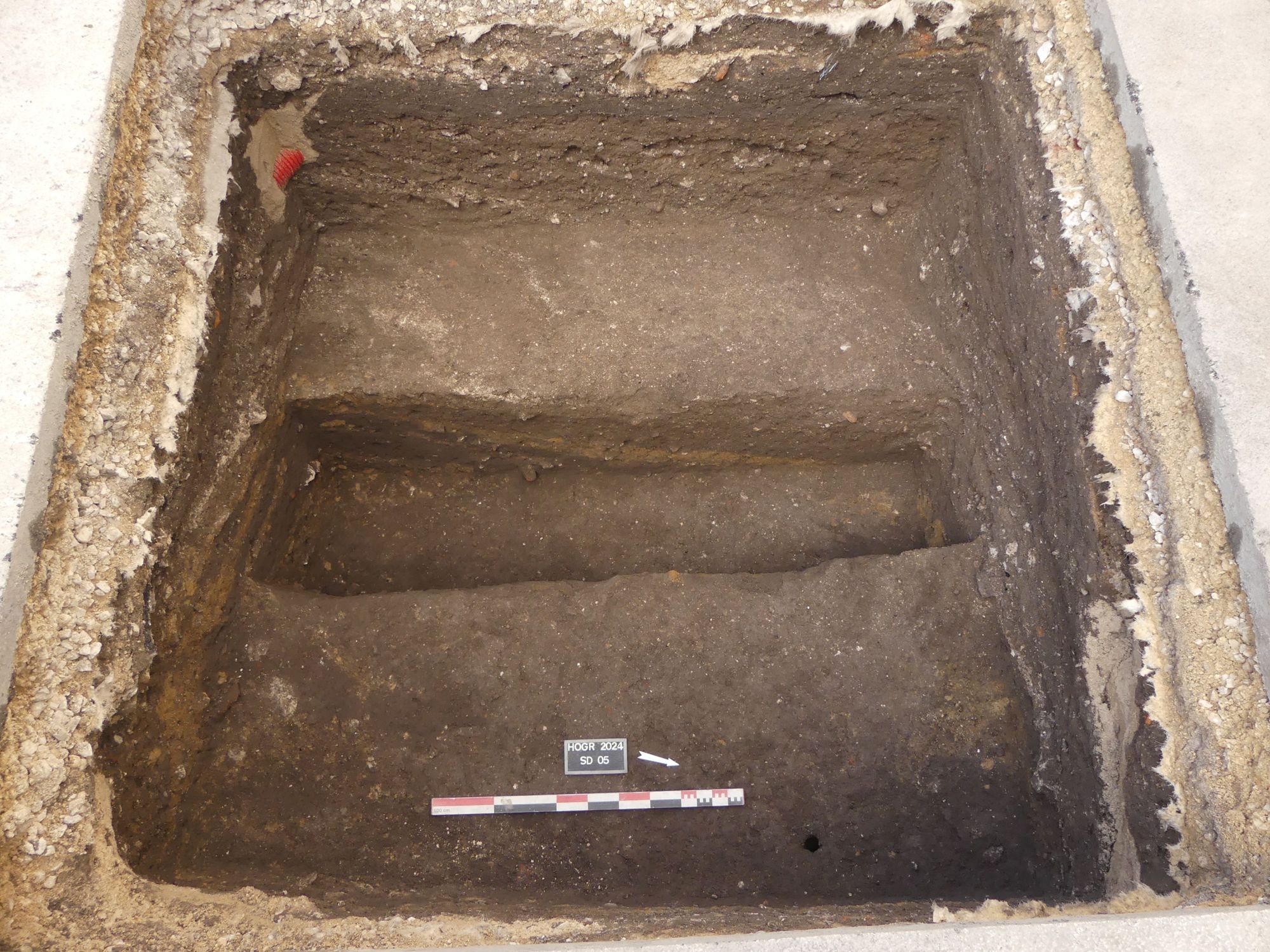 Les sondages carottés, sous la surveillance de Wendy Laurent et Caroline Millereux, ont permis de documenter l’ensemble de la puissance stratigraphique jusqu’au substrat géologique, inaccessible par les sondages archéologiques. En effet l'épaisseur de terrains anthropiques est de 5 à 6 mètres dans ce secteur.