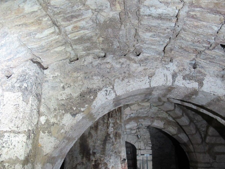 Les parois de certaines d'entre elles sont reprises par des maçonneries de moellons, et les voûtes doublées d'arcs et d'ogives en pierre de taille. Les voûtains conservent la trace des planchettes de bois (bardeaux) utilisés pour leur coffrage (voir photo). Ces aménagements des XIIIe et XIVe siècles permettent à la fois de consolider et de régulariser les espaces informes, résultats d'une logique visant initialement la seule exploitation des bancs de calcaire.