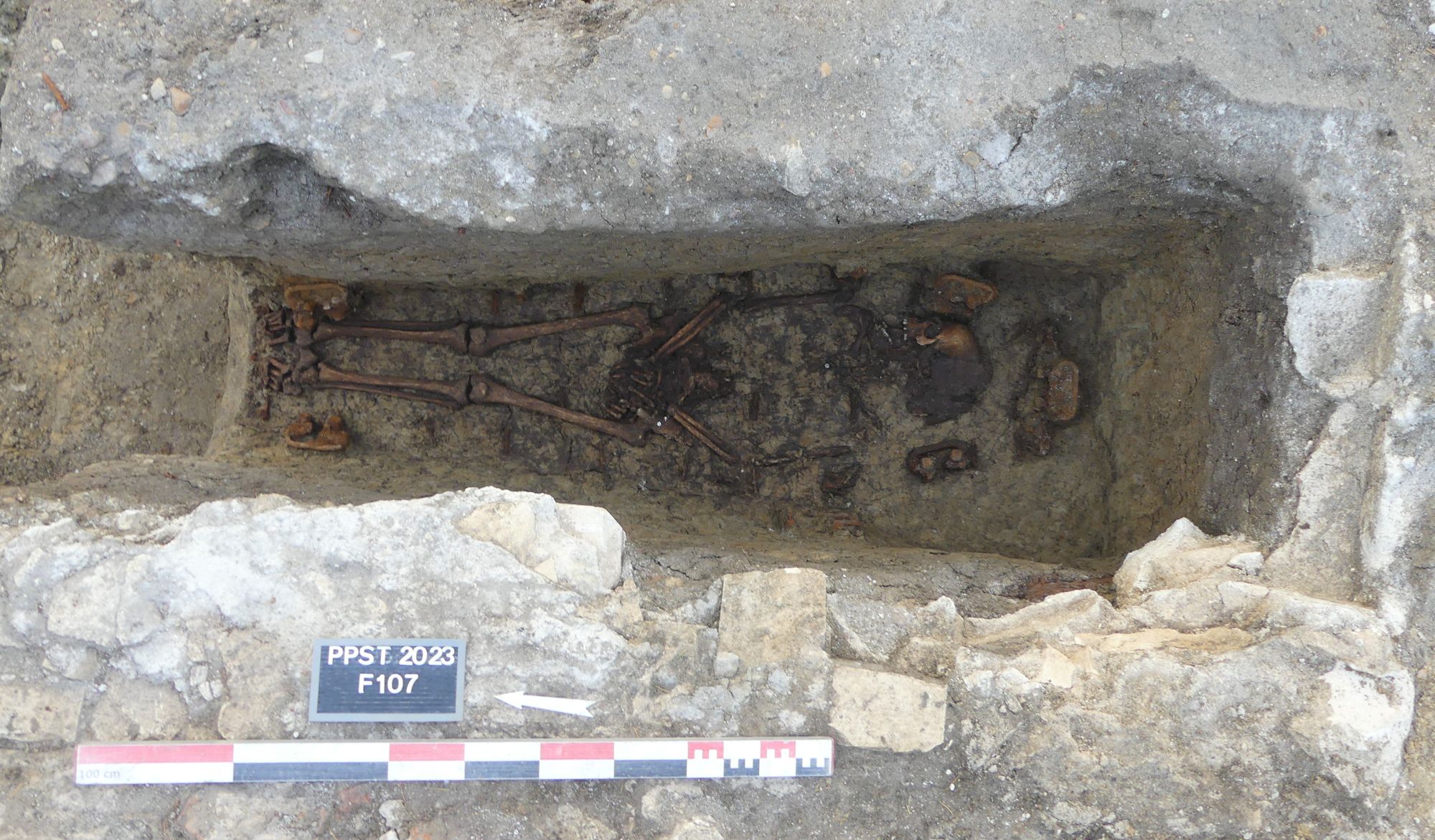 Pourtant, lorsque le sondage a commencé, une première sépulture est apparue, encore occupée… Au total, ce sont quatorze structures funéraires qui ont été découvertes. D’après les plans, il s’agissait de l’angle nord-est du carré de tombes n°18. La fouille a révélé que la moitié de ces structures ont été vidangées, ne laissant que sept individus en place avec les restes de leurs cercueils (clous, poignées, vestiges partiels de bois).