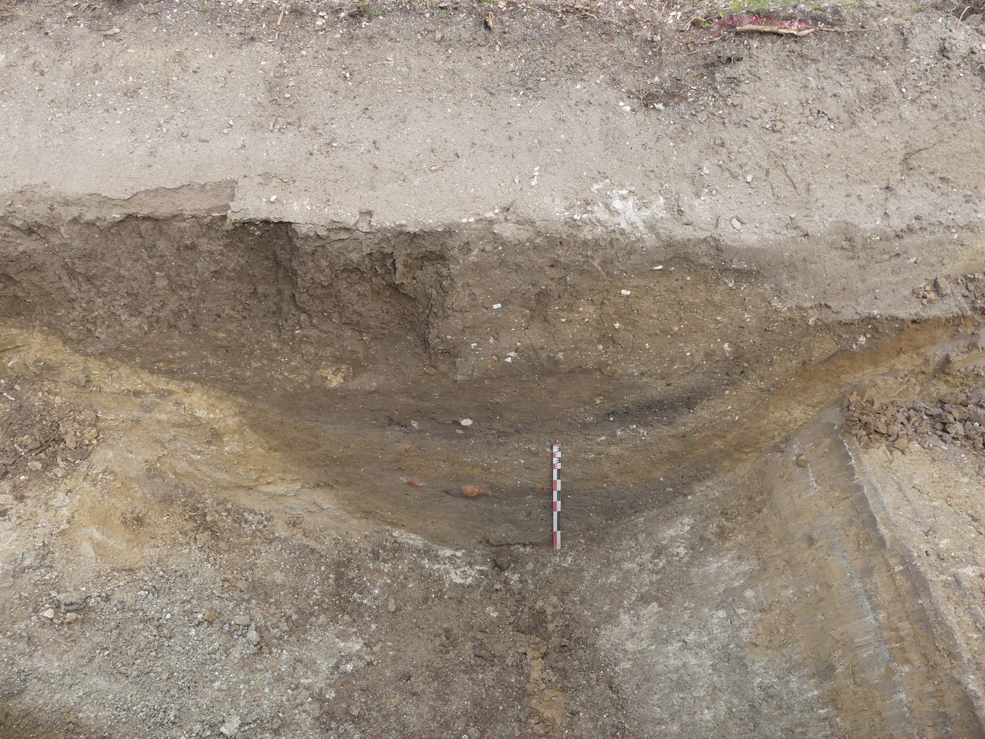 Sous les niveaux du cimetière contemporain, d’autres couches sont apparues, beaucoup plus anciennes. Quatre fossés datant de l’Antiquité ont ainsi été identifiés. Ils étaient tous parallèles et orientés est-ouest. Si trois d’entre eux avaient des dimensions plutôt modestes, le quatrième était large et profond : il présentait une ouverture très évasée de 8 m de large pour une profondeur maximum de 2,15 m. Il s’agissait donc d’un marqueur spatial important.