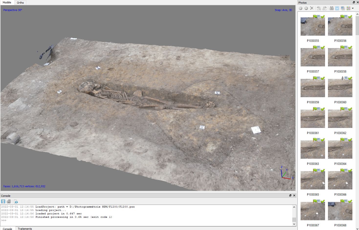 La méthode photogrammétrique, utilisée sur le chantier de l'Hôpital Porte-Madeleine, permet d'effectuer de relevés en 3D de manière très rapide et efficace. Ainsi, plusieurs sépultures mises au jour ont fait l'objet de ce type de relevé : les modélisations obtenues permettront de restituer la position des corps ou l'architecture de la tombe, mais aussi de proposer au public une vue en 3D d'un chantier archéologique en cours !