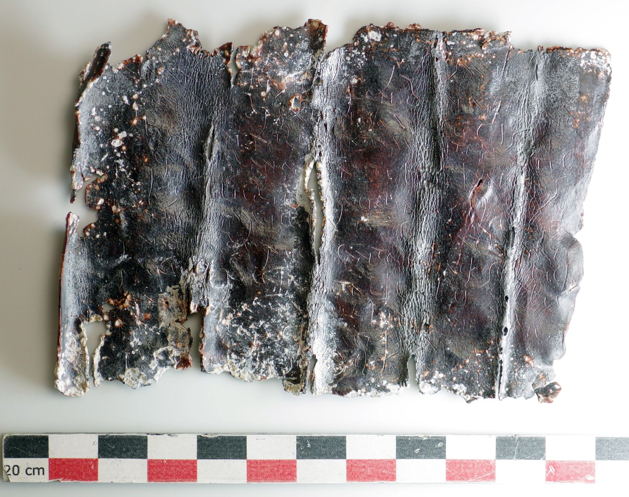 Quelques sépultures ont livré de petites feuilles de plomb, dont certaines enroulées sur elles-mêmes, et déposées à proximité des défunts. Pour la sépulture qui va nous intéresser plus particulièrement ici, la plaque de plomb a été retrouvée entre les jambes de l'individu, à côté d'un vase écrasé et de plusieurs monnaies.