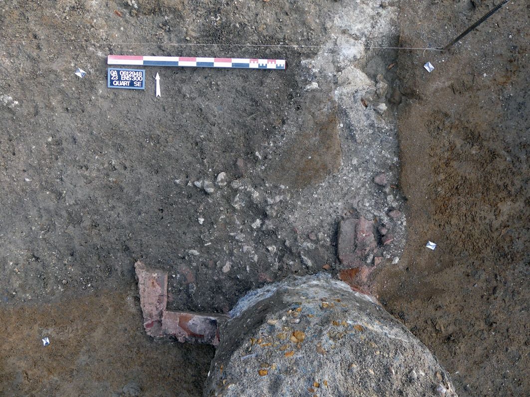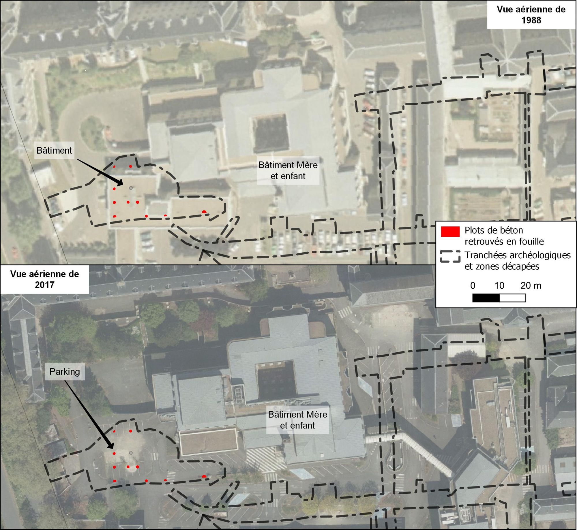 Lors du décapage de la seconde phase débutée en juin, plusieurs plots circulaires en béton ont été mis au jour, disposés à espace régulier. Certains viennent d'ailleurs percer des vestiges archéologiques, dont des maçonneries du Moyen Âge ! Si l'équipe archéologique s'est un temps demandée à quoi pouvait bien servir ces massifs maçonnés, les photos aériennes prises depuis les années 1950 ont montré qu'il s'agissait des fondations du bâtiment de pneumologie accolé à la maternité, détruit en 2005 pour laisser place à un parking. Les archéologues étant dotés d'un esprit très pragmatique et pratique, ces plots de béton ont toujours leur utilité puisqu'ils leur servent de "tables d'appoint" !