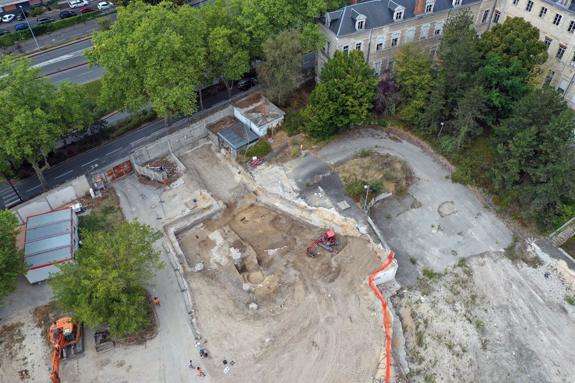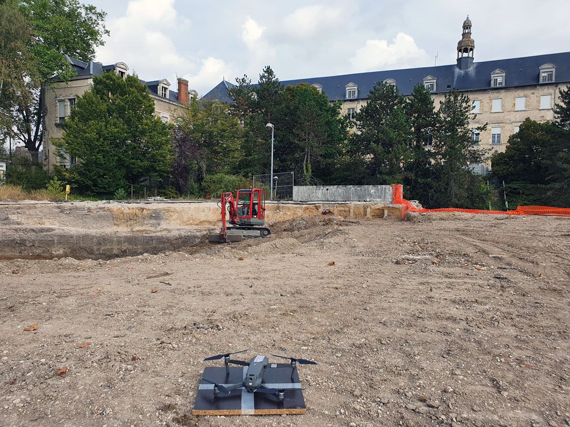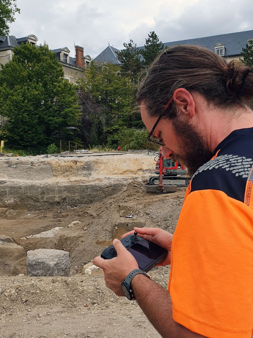 Un nouvel outil a été utilisé durant cette semaine sur le chantier de l'ancien Hôpital Porte-Madeleine : un drone ! Dans le cadre d'une prestation, un collègue du service d'archéologie du Loiret a réalisé une série de clichés, vidéos et relevés en 3D de la zone actuellement en cours de fouille.