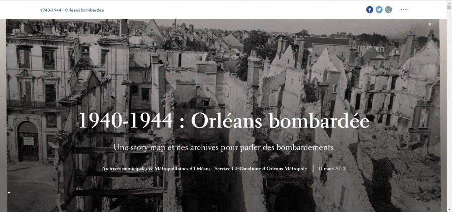 À l'occasion des 80 ans des bombardements de mai et juin 1940, les Archives municipales et métropolitaines ont réalisé, en collaboration avec le service GEOmatique d'Orléans Métropole, une story map. Cet outil a pour but de présenter de façon dynamique quelques sources relatives aux bombardements de 1940 et à ceux de 1944 qui ont à jamais modifié la physionomie de la ville.