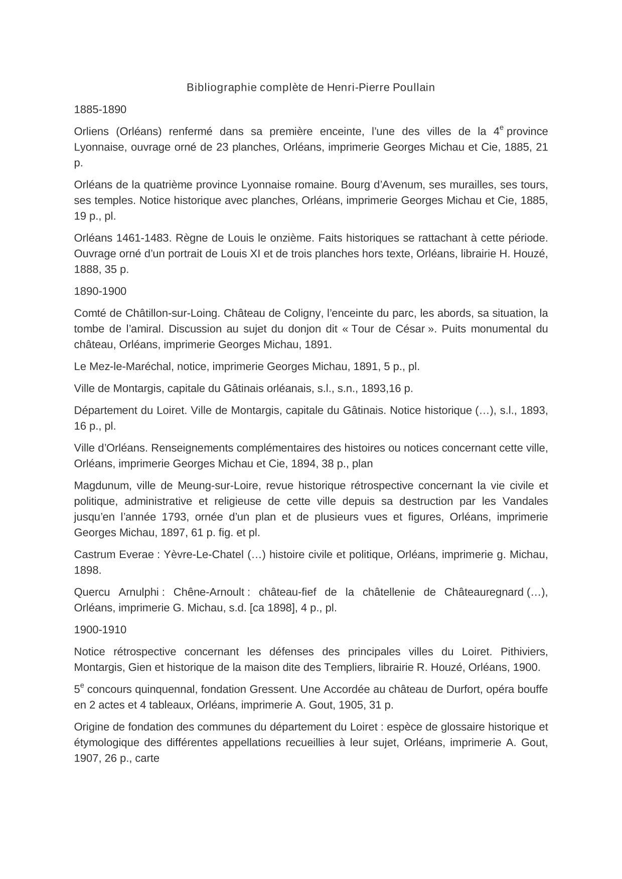 - Orliens (Orléans) renfermé dans sa première enceinte, l’une des villes de la 4e province Lyonnaise, ouvrage orné de 23 planches, Orléans, imprimerie Georges Michau et Cie, 1885, 21 p.