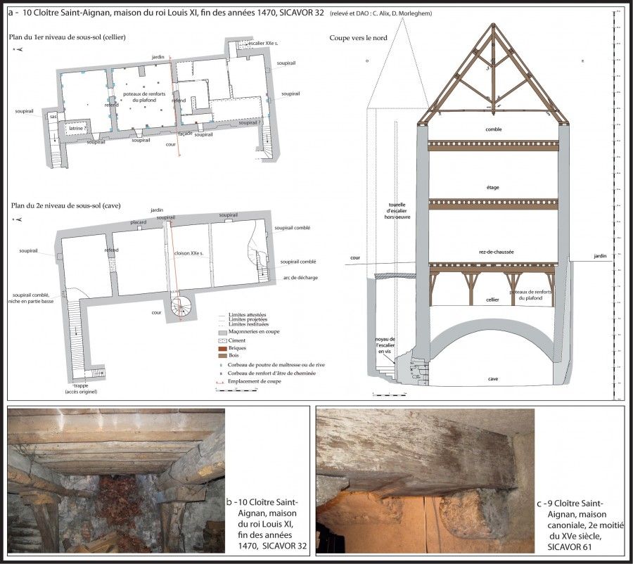 Les plafonds encore en place datés par dendrochronologie ne sont pas antérieurs au milieu du XVe siècle, comme au 85 rue de la Charpenterie, au 9 Cloître-Saint-Aignan ou dans la maison que le roi Louis XI s’est fait construire au 10 Cloître Saint-Aignan.