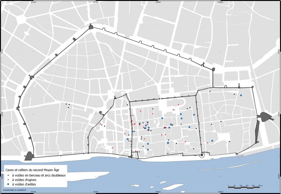 Les caves à voûtes d'arêtes sont présentes uniquement dans la ville médiévale protégée par l'enceinte tardo-antique, tout comme celles à voûtes d'ogives, qui se répartissent également dans l'extension occidentale de l'enceinte édifiée entre les XIIIe et XIVe siècles.