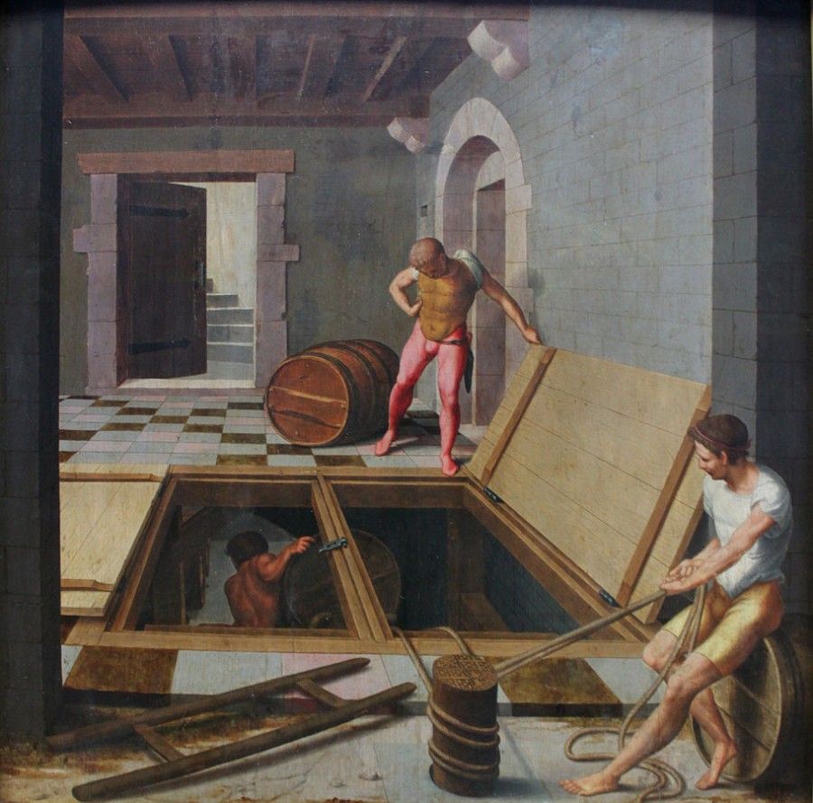 Les fûts étaient portés à l’aide de poulains ou glissés sur des planches posées sur les marches, retenus par des cordes attachées à des barres de bois ou à anneaux fichés en haut de l'escalier. La présence de tonneaux n’est pas strictement synonyme de celle du vin puisque des viandes et poissons salés, des boissons diverses comme la bière, le cidre, le verjus ou le vinaigre pouvaient être stockés dans ces contenants.