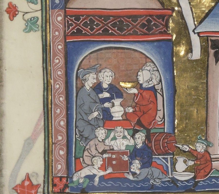 « [A Orléans] Il passe devant un cellier, où de mauvais garçons jouaient aux dés : ils venaient, sur un coup, de se prendre aux cheveux, puis de se raccommoder ; ils étaient tout déchirés et sanglants. L’hôte avait pris les dés en main et avait dit aux compagnons : « Ecoutez-moi ! Je mets pour enjeu, à ce coup, une pleine mesure de mon meilleur vin. Mais tenez-vous en paix. Celui qui voudra faire du tapage, qu’il vide mon cellier. Je ne veux pas de querelles ! » Tous lui avaient promis d’être sages et venaient de se rasseoir à leur table. A ce moment passait Aïoul sur son cheval. « Tenez, dit l’hôte, je vois venir un chevalier qui arrive pour sûr du pays des fées ; laissez-moi lui dire un mot. Il s’approche d’Aïoul comme hors de lui, et lui dit : « Sire, écoutez. On vend chez moi du bon vin, et on y joue aux dés. Un de ces sergents a perdu, et dans son dépit il prétend que je lui ai fourni des dés pipés. Sire, on me tient pour prud’homme dans la ville, et je ne voudrais pas avoir de blâme. Voici les trois dont ils ont joué : prenez-les, regardez-les bien, et jugez s’ils sont bons ; nous nous en remettons tous à vous. - Vous tombez mal, dit Aïoul : je n’ai jamais vu jouer aux dés et je n’y connais rien. Demandez ce jugement à d’autres. - Vassal, dit l’hôte, vous n’en serez pas quitte ainsi ! » Il le prend par le frein, tire à lui, et le fait reculer devant le cellier. Marchegai [le cheval] le regarde : il lève son pied droit, qui était gros et carré, et le frappe au milieu de la poitrine d’un si merveilleux coup qu’il lui brise quatre côtes et l’envoie rouler dans son cellier son compter les degrés. » (Chanson d’Aïoul : premier exploit d’Aïoul, éd. Paris 1922, p. 56-57).