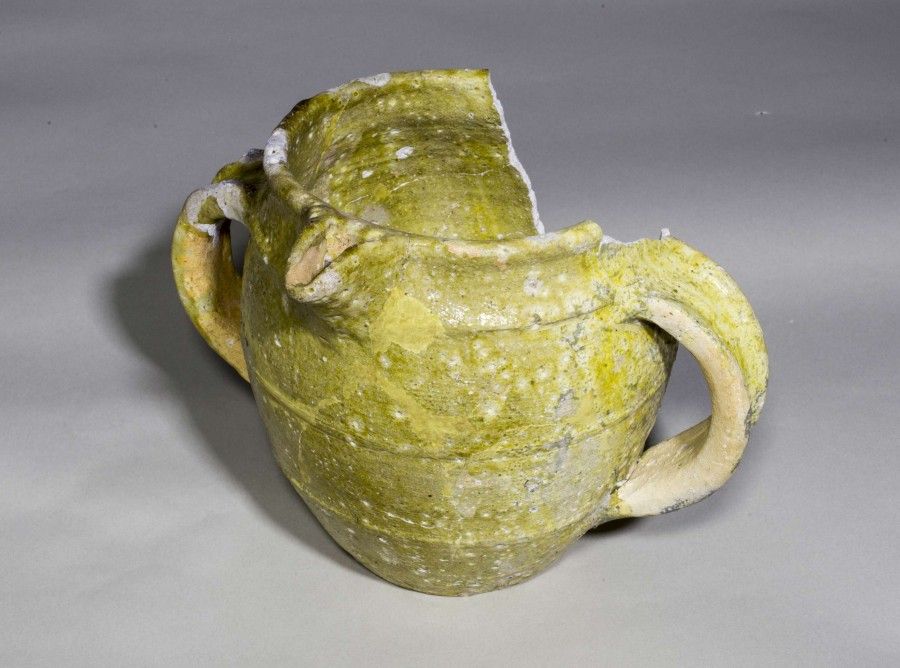 Ce vase a été retrouvé dans le comblement de latrines lors de la fouille du 80 quai du Châtelet . Ces lieux d'aisance sont quasiment systématiquement associés à la chambre dans l’architecture médiévale encore en élévation. Il se compose de deux becs verseurs opposés, pontés et tréflés, ainsi que de deux anses plates massives à large gorge rattachées sur le col et diamétralement opposées. L’ensemble est protégé par un revêtement lisse de couleur jaune : on parle de glaçure.