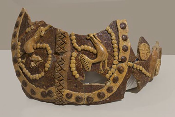 Ces fragments de cruche, datant du XIe siècle, proviennent de l’îlot de la Charpenterie. Sur la panse, figure un décor d’appliques de sirènes et de rangs de perles glaçurées jaune, à l’intérieur d’un demi-cercle formé par un cordon rapporté également jaune et rehaussé de pastilles marrons. De part et d’autre sont apposés des cordons entrelacés jaunes avec un décor d’incisions. L’ensemble de la panse est glaçuré marron.