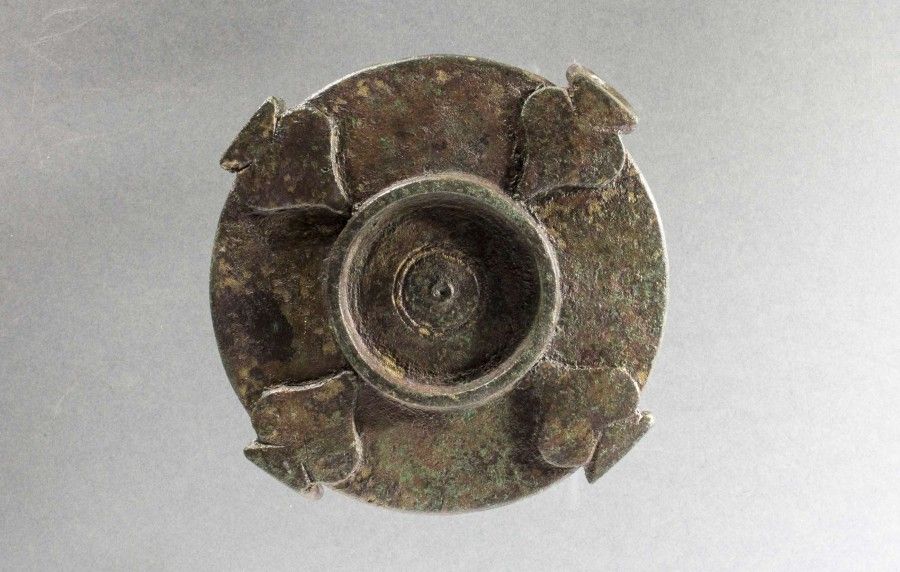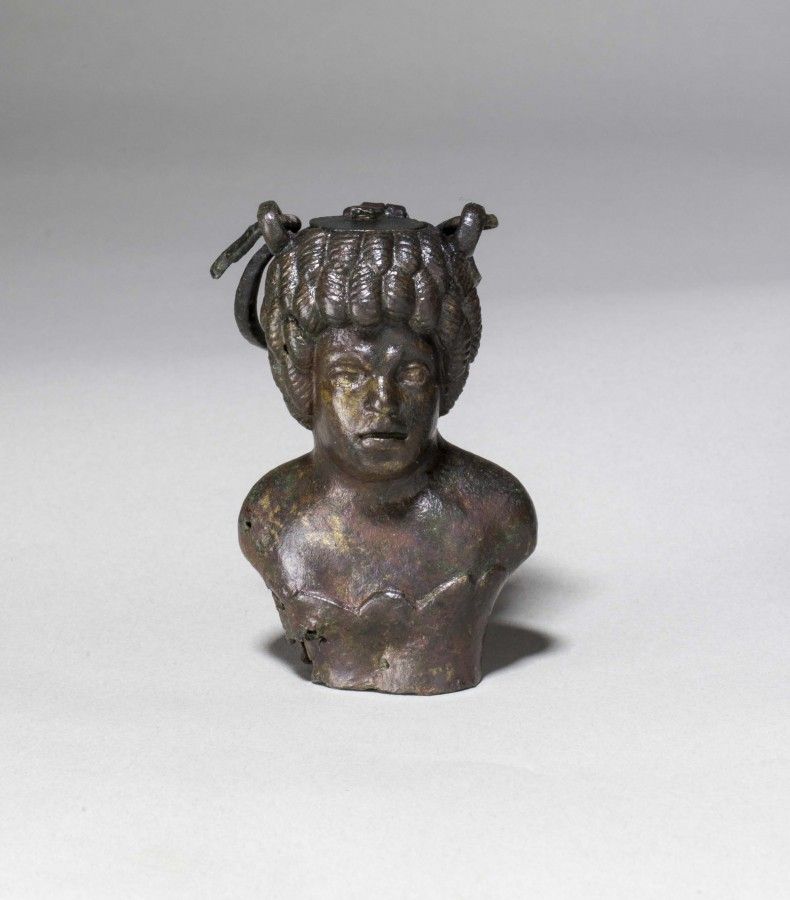 Particularité : cet objet constitue, à ce jour, l'unique exemplaire connu associant un décor en verre millefiori et une figuration de divinité en bronze