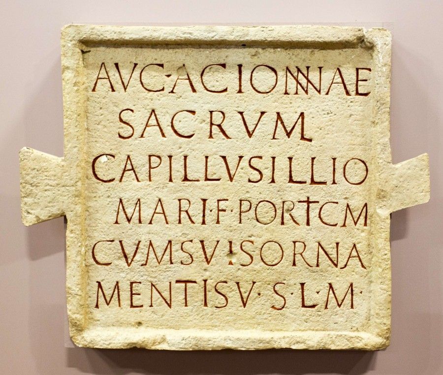 AUG(ustae) ACIONNAE SACRUM CAPILLUS ILLIOMARI F(ilius) PORTICUM CUM SUIS ORNEMENTIS V(otum) S(olvit) L(ibens) M(erito).