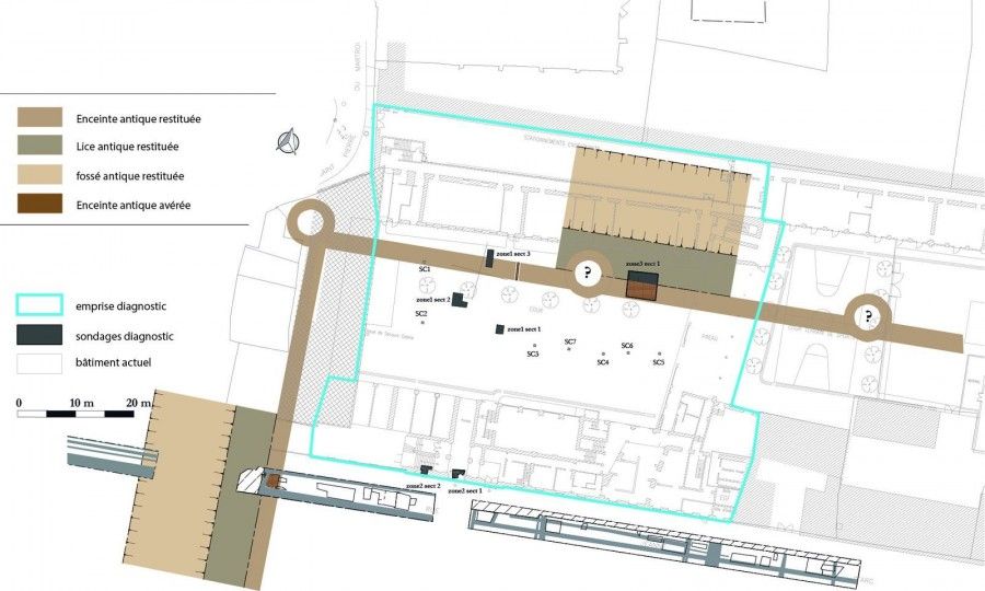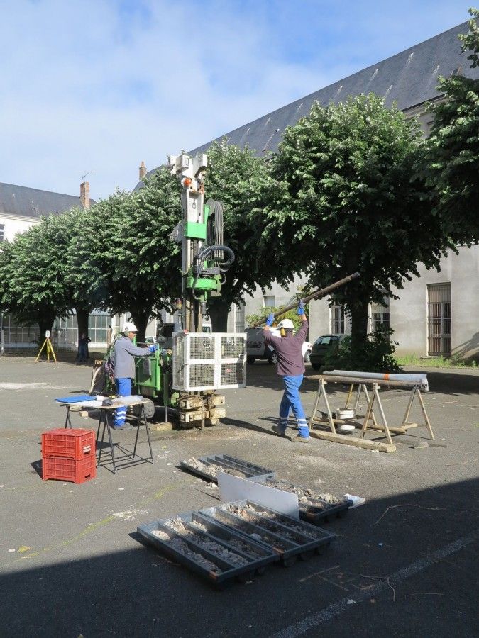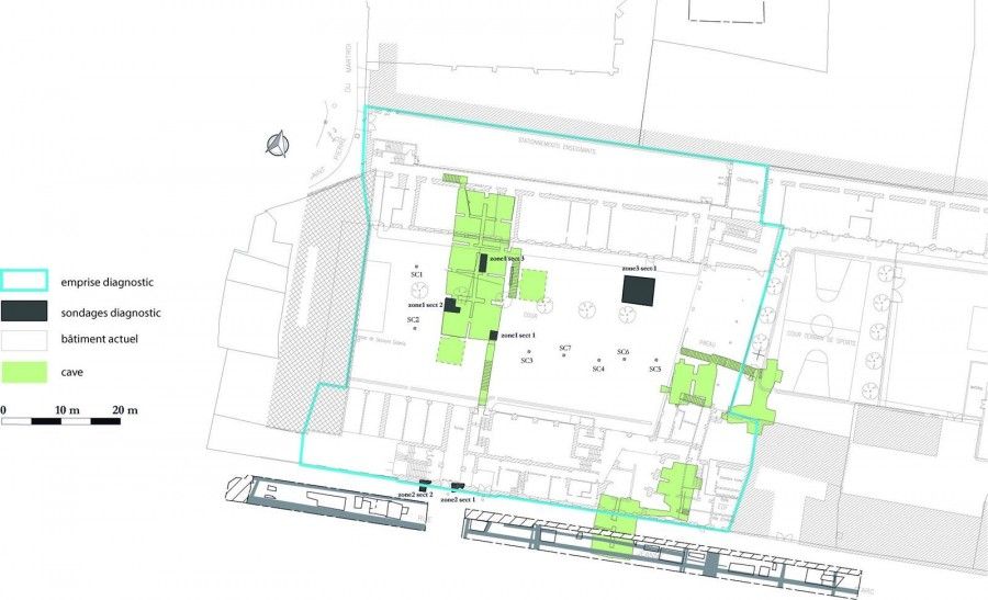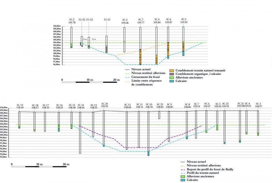 En fonction de la restitution de cette topographie historique du site, des sondages manuels et mécaniques ciblés ont été positionnés. Soit depuis les caves pour renseigner la partie basse de la stratigraphie, soit depuis la cour concernant la partie supérieure de la stratigraphie. Ils ont été complétés par sept sondages géotechniques carottés qui ont permis d’approcher la séquence stratigraphique complète.
