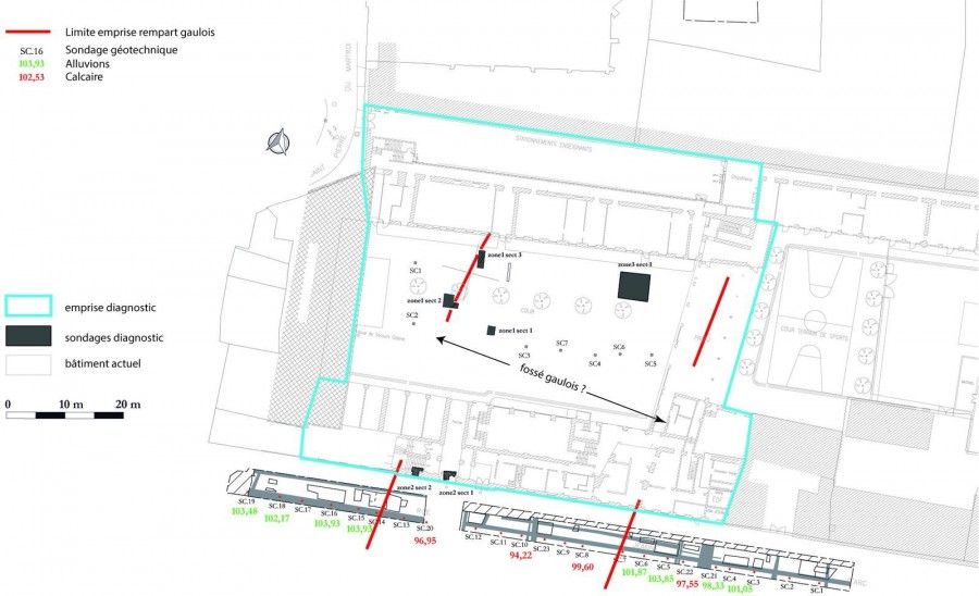 Aujourd’hui, les observations faites dans la cour du Collège donnent corps à l’existence de ce vaste fossé comblé durant la période augustéenne. La largeur importante de l’ouvrage plaiderait en faveur d’un rempart à talus massif, également désigné sous l’appellation rempart de "type Fécamp" et dont les spécialistes s’accordent à reconnaître le rôle hautement défensif. Ce type de rempart apparaît dans le second quart du Ier s. av. J.-C. et serait utilisé tout au long de ce siècle. Ces aménagements se rencontrent pour des sites de tailles très variables allant de quelques hectares à plusieurs dizaines d’hectares, sans répartition géographique apparente, les découvertes se faisant sur presque toute la Gaule.