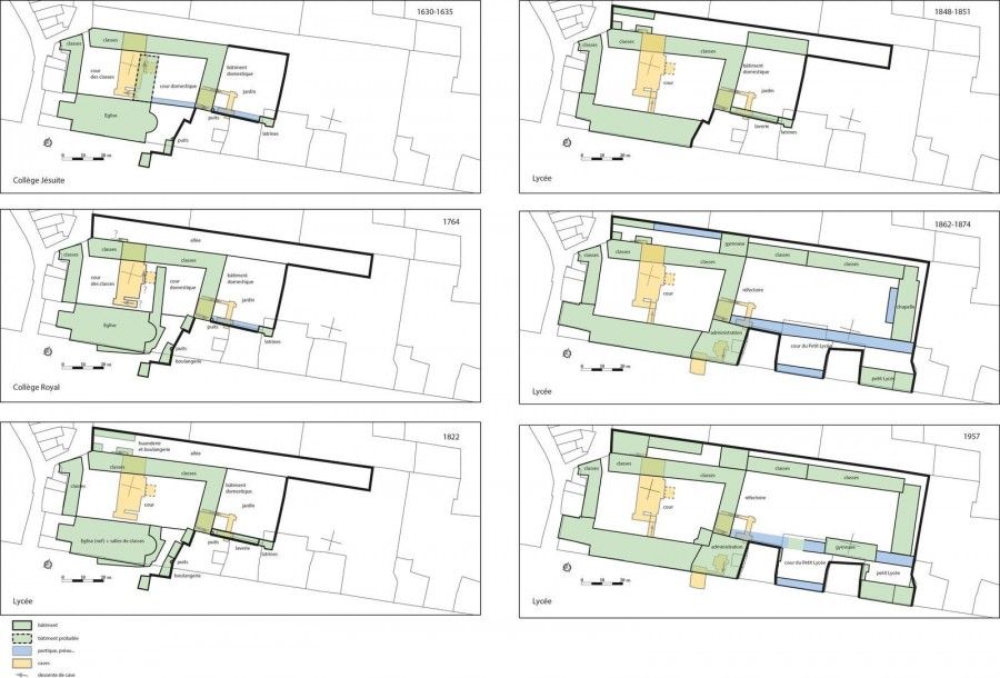 De la période d’occupation par les Jésuites, on retiendra globalement la volonté d’adapter un site à sa nouvelle fonction de Collège, par un ordonnancement simplifié et clair prenant malgré tout appui sur l’existant. La permanence des cours en partie centrale est un exemple particulièrement éclairant de ces travaux.