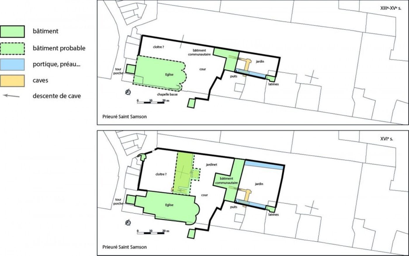 Au XVIe siècle une importante phase de construction semble impacter la cour avec le creusement d’un vaste réseau de caves nord-sud éradiquant 6 m de stratigraphie antique et médiévale sur son emprise. Ce développement est associé à l’extension de la propriété du prieuré vers le nord, avec l’insertion en 1504 de l’emprise du mur d’enceinte et de celle du fossé situé au-devant. Bien que passé sous silence par les sources, cette période doit également connaître un agrandissement vers l’est de l’église Saint-Samson pour prendre les dimensions qu’elle aura sur le plan d’état de lieux de 1620. Malheureusement les observations conduites n’ont pas permis de préciser la date exacte de cette extension.