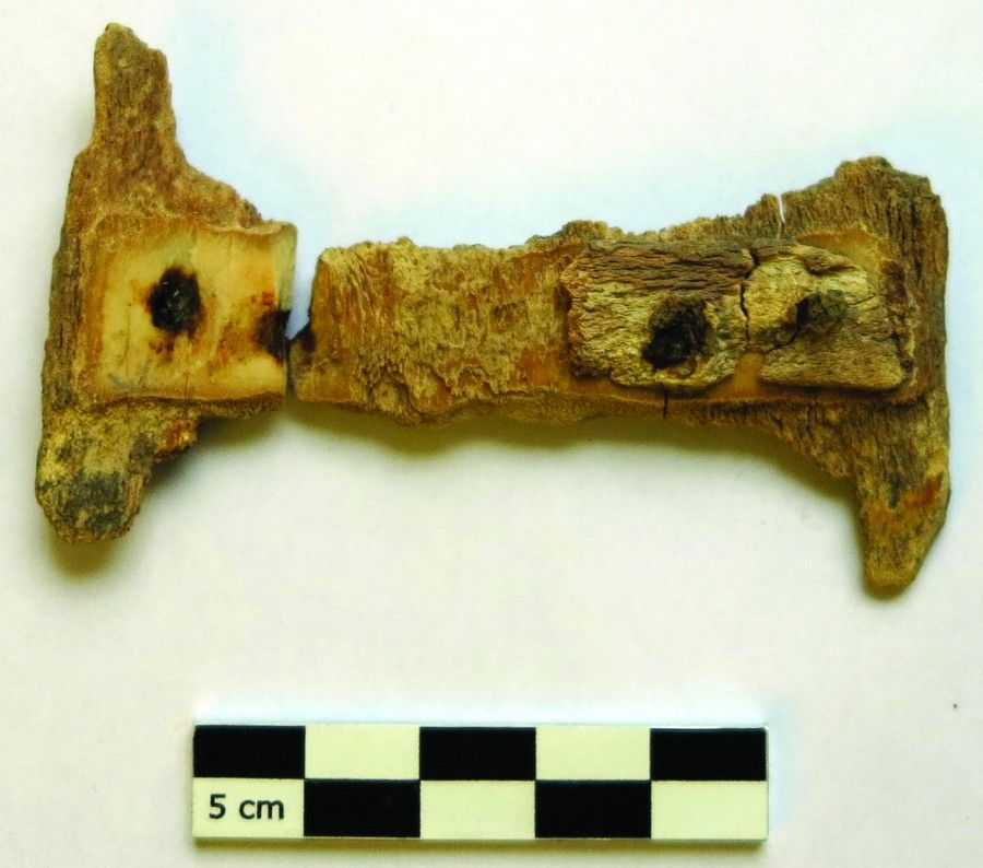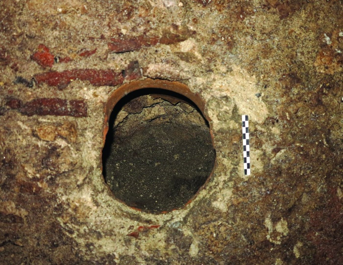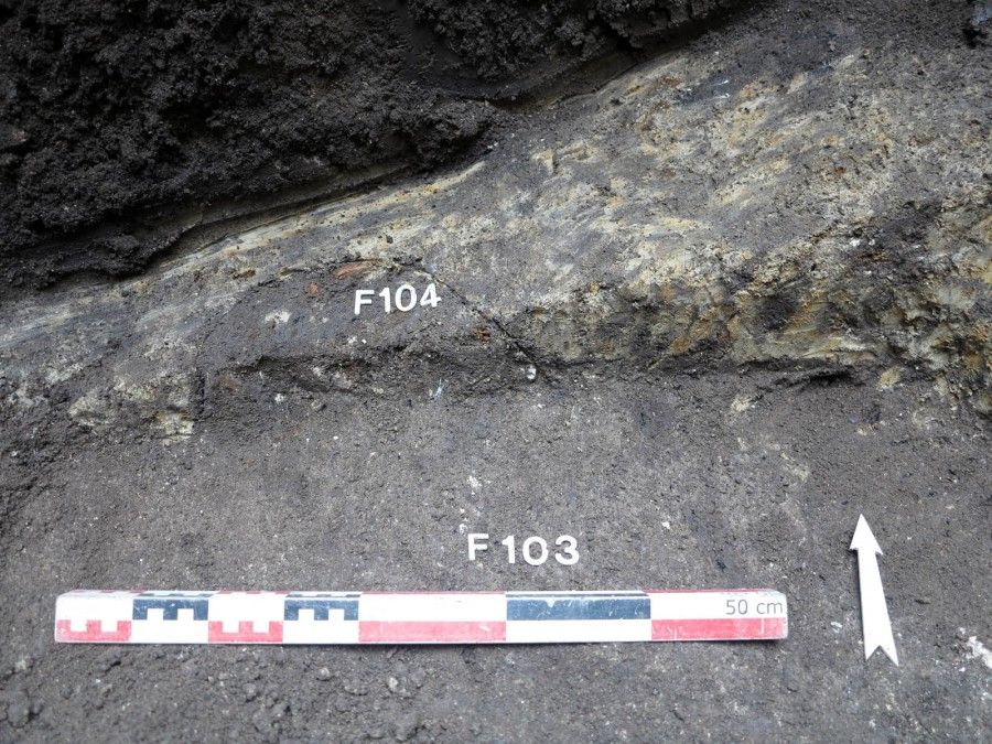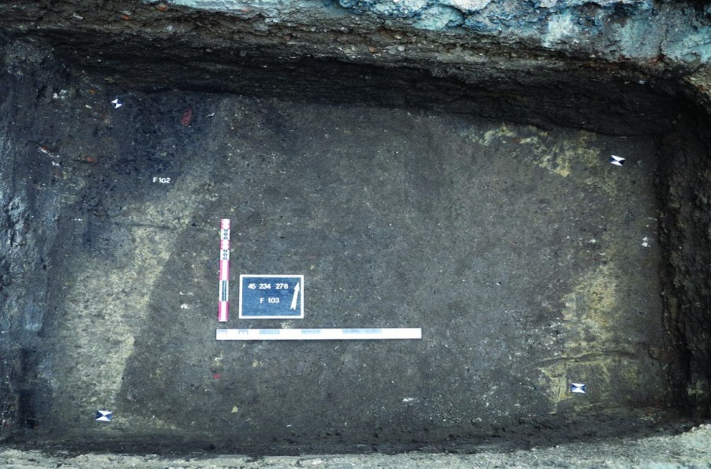 Au fond du sondage de l’arrière-cour, à environ 1,20 m sous le sol actuel, deux petits trous de poteau et une fosse peu profonde sont conservés et percent le substrat naturel sablo-argileux. Leur comblement a livré du mobilier céramique datant du début du Ier s. ap. J.-C. Il pourrait s’agir d’une petite occupation domestique (habitat ? atelier ?) située en limite de la ville du début de l’époque romaine.