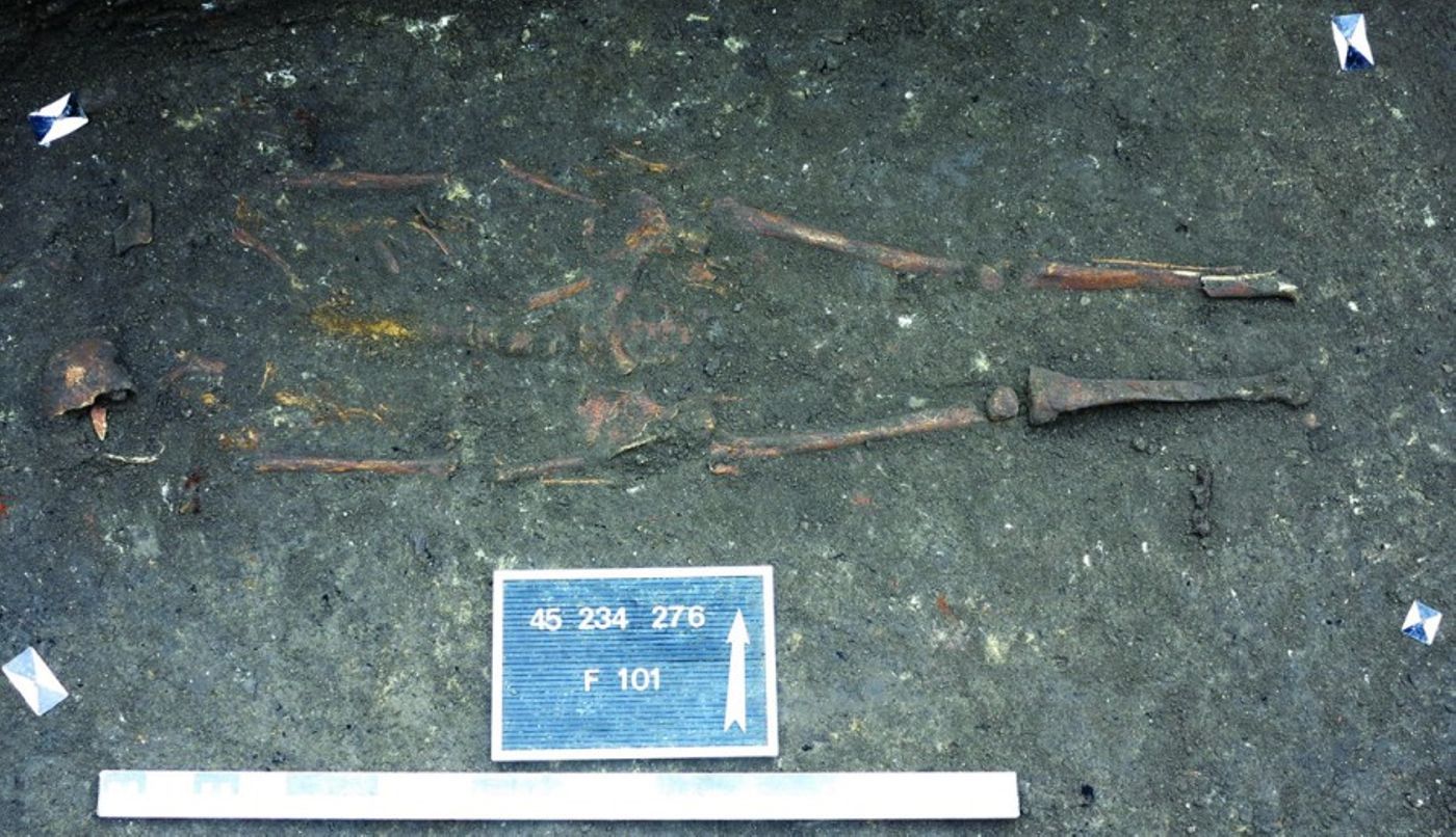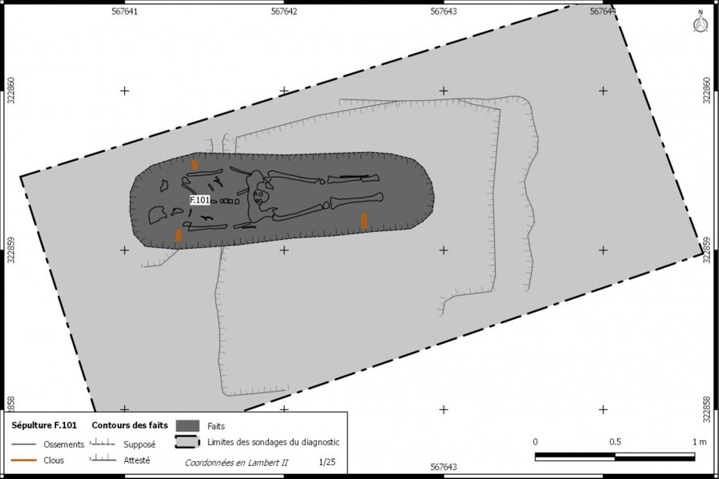 Il s’agit d’un individu adulte, inhumé sur le dos, les bras posés sur l’abdomen et tête à l’ouest. La fouille a permis d’identifier trois clous bordant l’individu et marquant sans doute les vestiges d’un cercueil.