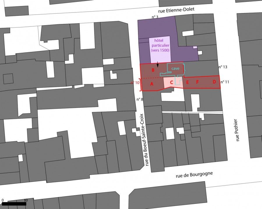 La maison étudiée (en rouge sur le plan) se compose aujourd’hui d’un regroupement de plusieurs anciennes habitations. Deux bâtiments jointifs (A et B) donnent à l’ouest sur la rue du Bœuf-Sainte-Croix. C’est la façade de celui du sud (B) qui a fait l’objet de l’étude archéologique du bâti. Le bâtiment nord (A), quant à lui, comporte une cave médiévale (XIIIe – XIVe siècle), dont une pièce s’étend sous la cour (C). Vers 1500, ce bâtiment nord (B) dépendait de la propriété voisine, au n° 3 rue Etienne-Dolet, correspondant à un vaste hôtel particulier dont les nombreux corps de bâtiments s’organisent autour d’une cour. C’est entre 1779 et 1823 que la maison n° 10 rue du Bœuf-Sainte-Croix est agrandie par le regroupement de propriété avec la maison voisine à l’est, n° 11 rue Pothier. Cette dernière se compose d’un corps de bâtiment en front de rue (D) suivie d’une cour (F) dont le fond est occupé par un petit corps de bâtiment (E).