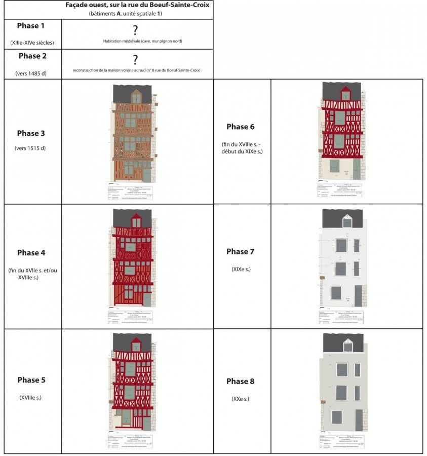 Comme cela a été souvent observé à Orléans, la façade du bâtiment sud a subi plusieurs remaniements successifs entre le XVIIe siècle et la fin du XVIIIe siècle (phases 4 à 5) : mise au goût du jour du traitement des pièces de bois (couleur rouge foncé) et du hourdis, modifications des fenêtres de l’étage (agrandissements, nouvelles menuiseries, création d’une nouvelle ouverture), reconstruction d’une partie du rez-de-chaussée en pan de bois. Avant 1779, les deux bâtiments furent réunis au sein d’une même propriété.