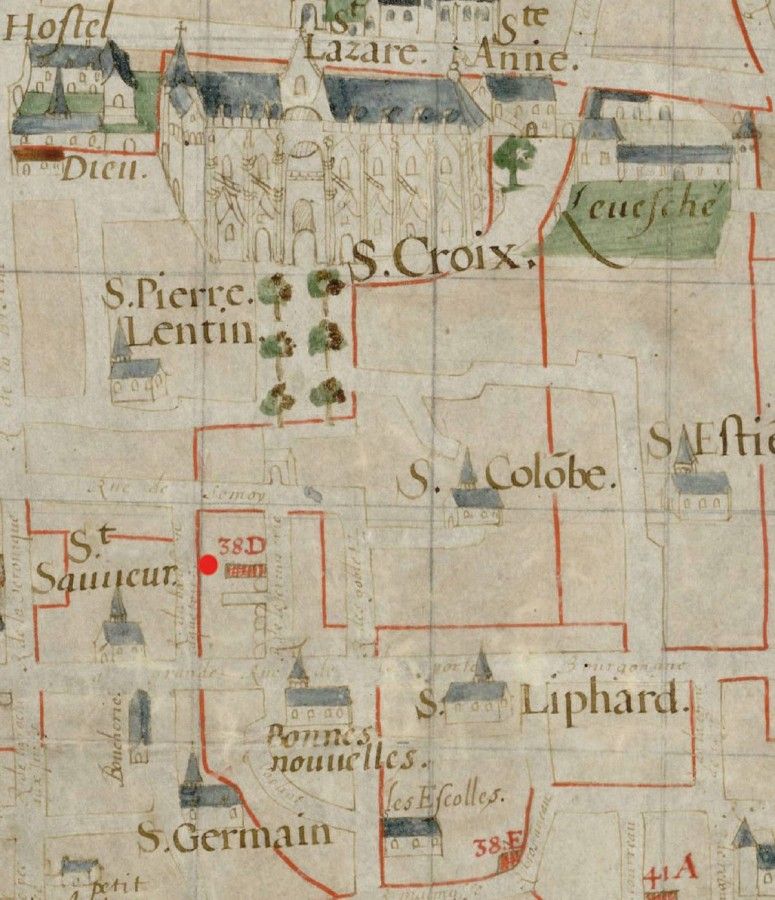 La maison n° 10 rue du Bœuf-Sainte-Croix se situe à 120 m au sud de la cathédrale, près de la limite méridionale supposée de l’ancien quartier canonial. Sur le plan de Fleury, réalisé en 1640, la maison (localisée par un point rouge) se trouvait dans la paroisse Bonnes-Nouvelles. Au Moyen Âge, le couvent de Bonnes-Nouvelles se dressait au sud de la rue de Bourgogne, à l’emplacement de l’actuelle Préfecture. Ce couvent serait mentionné vers 800 avant de devenir un chapitre collégial puis un prieuré et de subir une importante reconstruction dans la seconde moitié du XVIIe siècle sous l’impulsion des bénédictins de la congrégation de Saint-Maur.