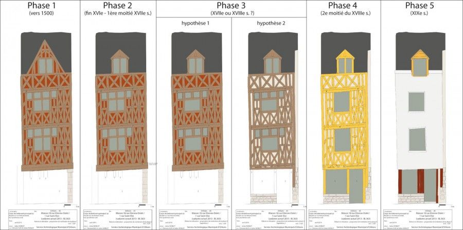 Dans la 2e moitié du XVIIIe siècle (phase 4), les pièces de bois de la façade sont peintes avec un pigment ocre-jaune. C’est sûrement à cette époque que les fenêtres principales des étages sont agrandies par la suppression de leur meneau et de leur traverse, tandis que les petits jours latéraux sont condamnés. La façade sera recouverte d’un enduit au plâtre au XIXe siècle (phase 5).