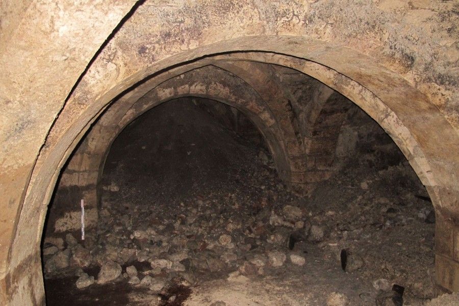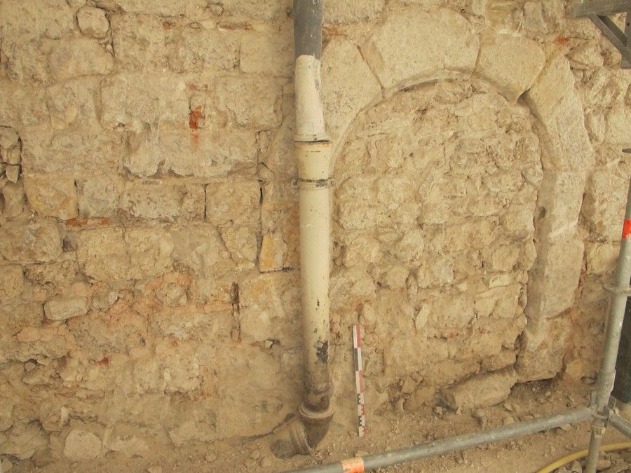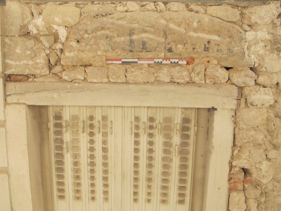 À l’ouest du rez-de-chaussée (à droite), le relevé montre les vestiges de la maison médiévale, avec le parement en pierre de taille, le linteau de la fenêtre et la porte d’entrée.