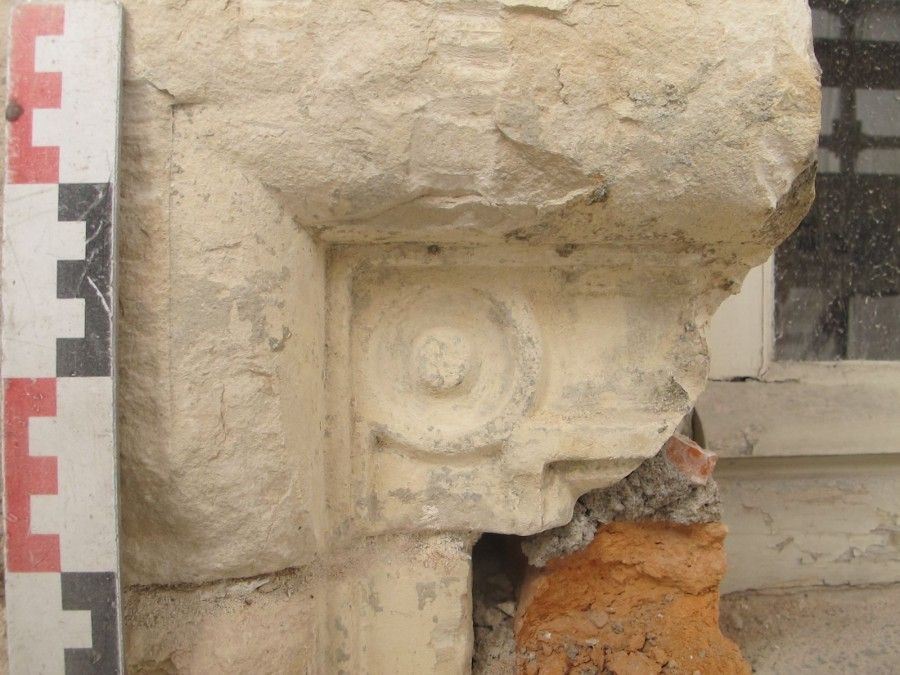À l’est du 1er étage (en haut à gauche), sont visibles les vestiges de la grande croisée de la Renaissance (ancienne fenêtre à meneau et à traverse), ornée de moulures et de petits disques dans les angles. Cette baie a été détruite lors du percement des fenêtres d’étages de la travée orientale. À l’extrémité ouest du mur (à droite), se trouve la chaîne d’angle de la façade construite au début du XIXe siècle rue Pothier.