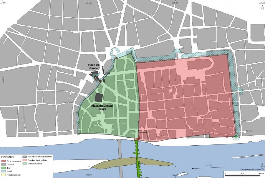 Concernant la topographie générale du terrain, il existe actuellement une légère pente en direction de la Loire. Cette topographie est-elle héritée ou existait-il initialement un petit talweg, traversant la place du nord au sud ? Cette question reste en suspens puisqu’aucun sol ancien, antérieur au milieu du Ier siècle avant J.-C., n’a été conservé en raison du dérasement et du nivellement du terrain pratiqué à cette période.