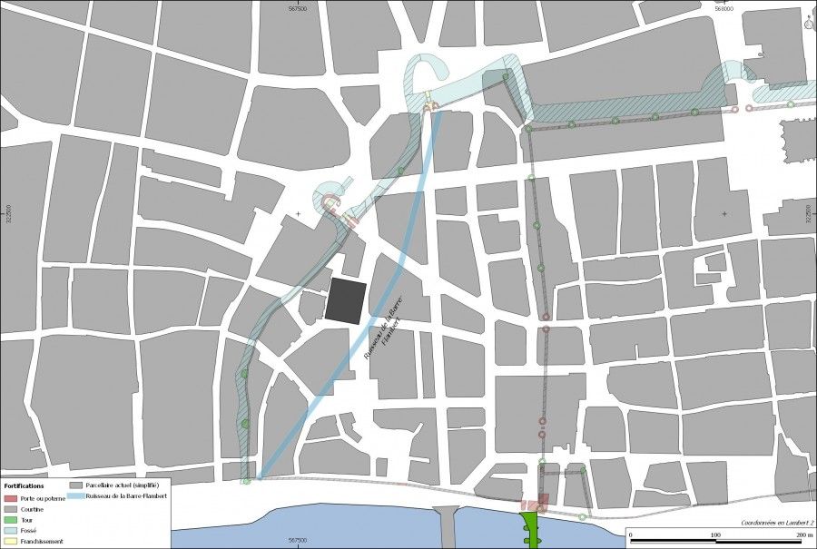 Il convient toutefois de rappeler la mention dans les textes, dès la fin du XIIIe siècle, d’un petit cours d’eau dit de "la Barre-Flambert", s’écoulant depuis la Place du Martroi en traversant la rue du Tabour, à l’intersection de la rue de la Vieille-Poterie, avant de franchir la rue du Cheval-Rouge et de se jeter dans la Loire à proximité de l’ancienne tour Flambert. Si les traces d’un tel cours d’eau n’ont pas été mises en évidence place du Cheval-Rouge, ce secteur est resté humide de tout temps, comme l’a attesté l’étude palynologique réalisée durant l’opération. Cependant, les analyses ont exclu la présence d’un cours d’eau pérenne en l’absence d’espèce spécifique à ce type de milieu. Ce cours d’eau, et le talweg associé, se situent très certainement en dehors de l’emprise de la fouille.