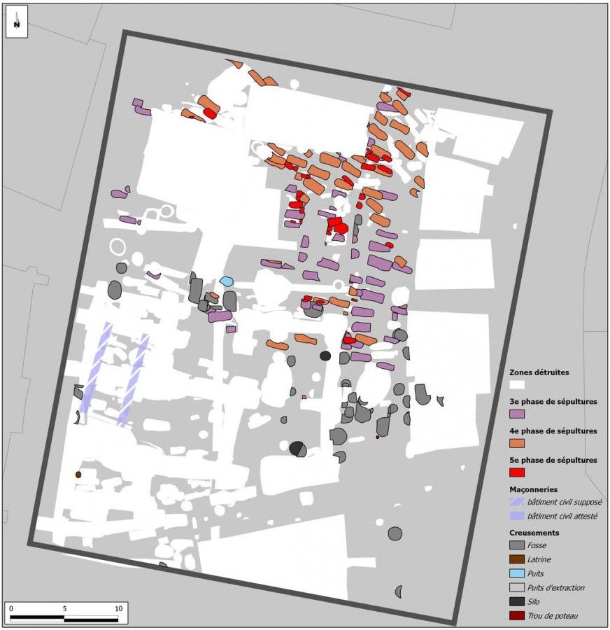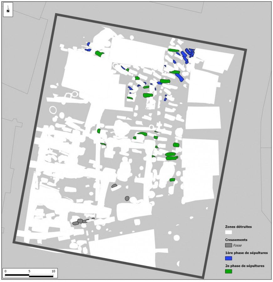 Dans la moitié nord du site, le secteur d’inhumation se densifie. Environ 150 tombes ont été observées. Les sépultures sont plus ou moins disposées en rangés suivant des axes légèrement différents pouvant recouvrir une certaine évolution chronologique. Toutefois, toutes celles-ci doivent se placer dans un laps de temps assez court en raison du peu de recoupements, et du mobilier qui, bien qu’en position résiduelle, est toujours daté des IXe et Xe siècles.