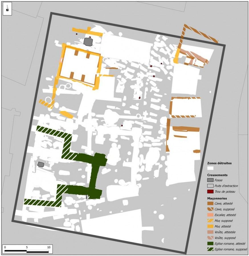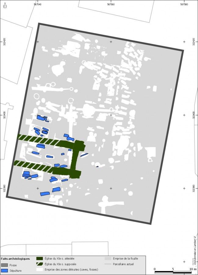 Il est probable que la nef de l’église ait été couverte de voûtes d’ogives comme le suggère quelques fragments de pierres taillées retrouvés en fouille. Ceux-ci s’ajoutent aux nombreux éléments retrouvés dans les années 1950 (clefs, claveaux, bases de piliers), dont le style est caractéristique de la fin du XIIe siècle. Le contexte stratigraphique indique que l’ensemble des maçonneries mises en œuvre lors de cette reconstruction est postérieur au XIe siècle. Certains éléments de poterie présents dans la tranchée de fondation du collatéral sud permettent d’envisager une datation du début du XIIIe siècle.