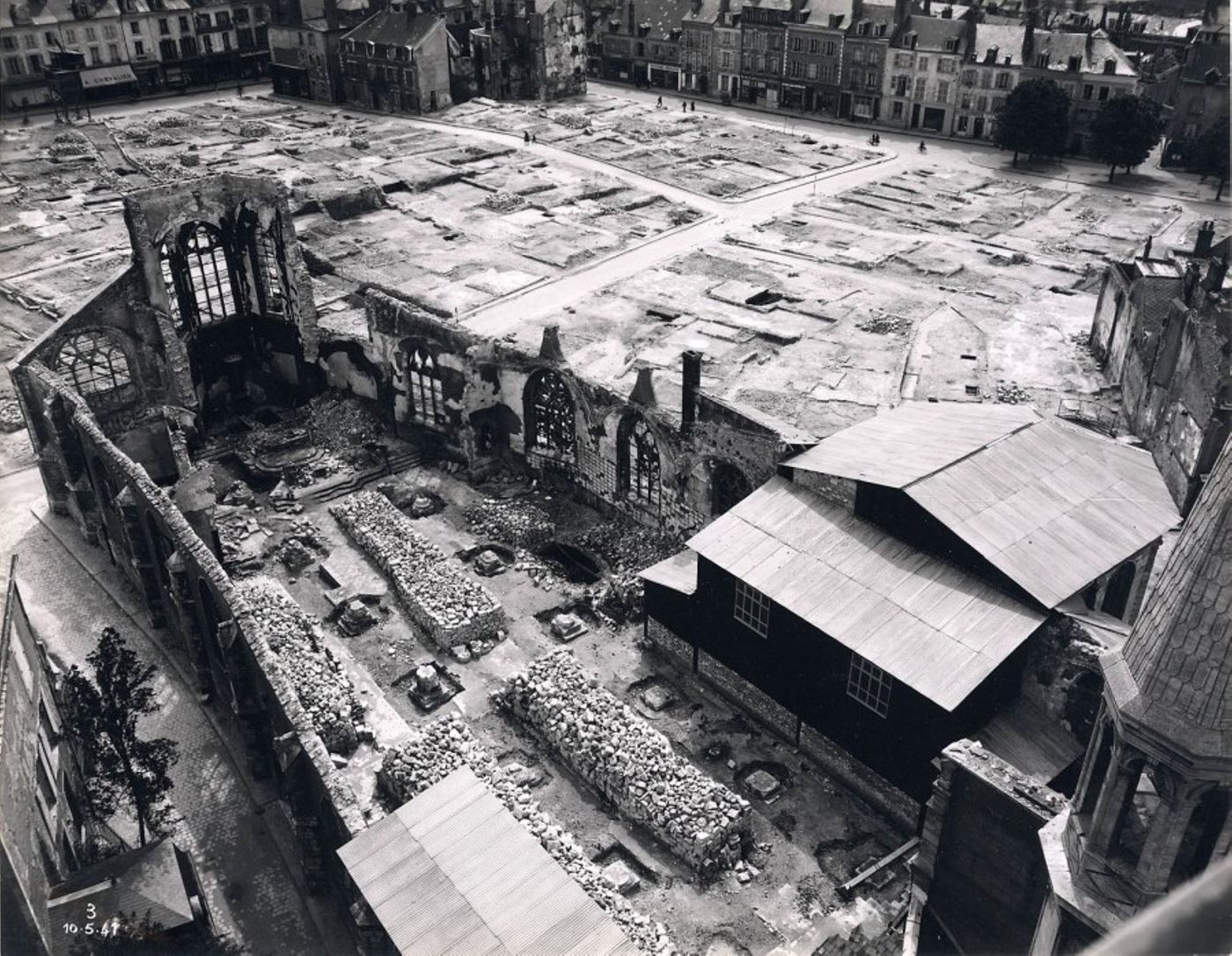 Les bombardements de juin 1940 mettent un terme à l’occupation du site. Cet épisode tragique a laissé des traces importantes notamment en raison de l’incendie qui a suivi, puis des étapes de récupération et de nivellement de la place intervenant tardivement dans les années 1950 pour la construction de la place et des immeubles adjacents.