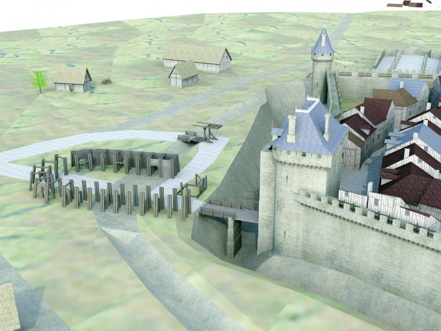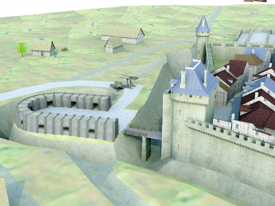 Avant le XIVe siècle, il faut imaginer une enceinte faite de levées de terre et de fossés, peut-être renforcée par une ou plusieurs palissades. Ce n’est qu’à partir du XIVe siècle que l’on peut restituer une courtine maçonnée et des bâtiments monumentaux à l’emplacement des portes.