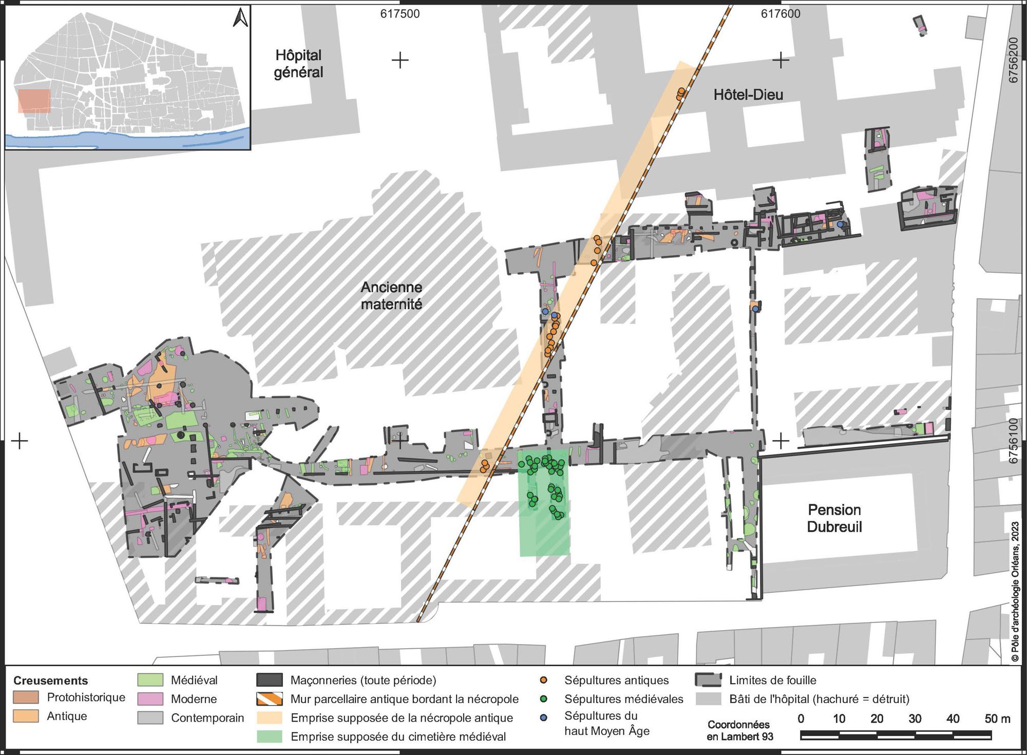 La fouille de l’Hôpital Porte Madeleine a débuté le 31 janvier 2022 et s’est achevée le 02 décembre de la même année. L’intervention archéologique a lieu dans le cadre d’une profonde transformation du site de l’ancien hôpital, avec l’installation d’une partie de l’université d’Orléans conduisant à la construction de bâtiment universitaires, ainsi que l’aménagement d’îlots résidentiels, d’un jardin public, etc. L’opération s’est déroulée selon trois phases : la première entre janvier et juin 2022 a consisté à fouiller à l’emplacement des tranchées de réseaux situées sous les futures voiries desservant le site, sur une surface décapée d’environ 2850 m² ; la seconde entre juin et août 2022 correspondait à l’emplacement du parking souterrain du futur bâtiment universitaire, sur une surface décapée de 936 m² ; la troisième phase, entre octobre et décembre 2022, concernait l’emprise du futur bâtiment universitaire hors parking souterrain, sur une surface décapée de 1036 m².