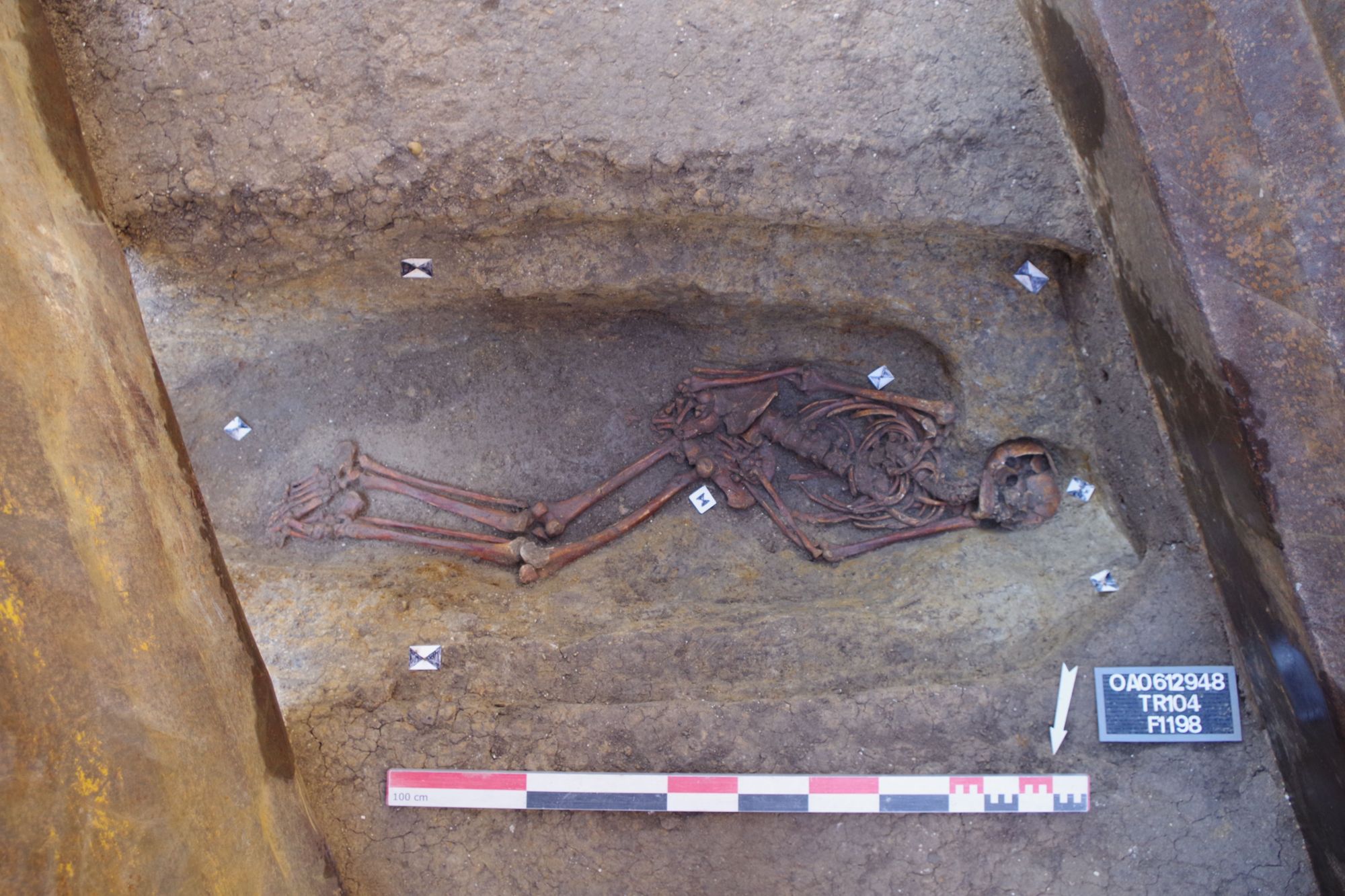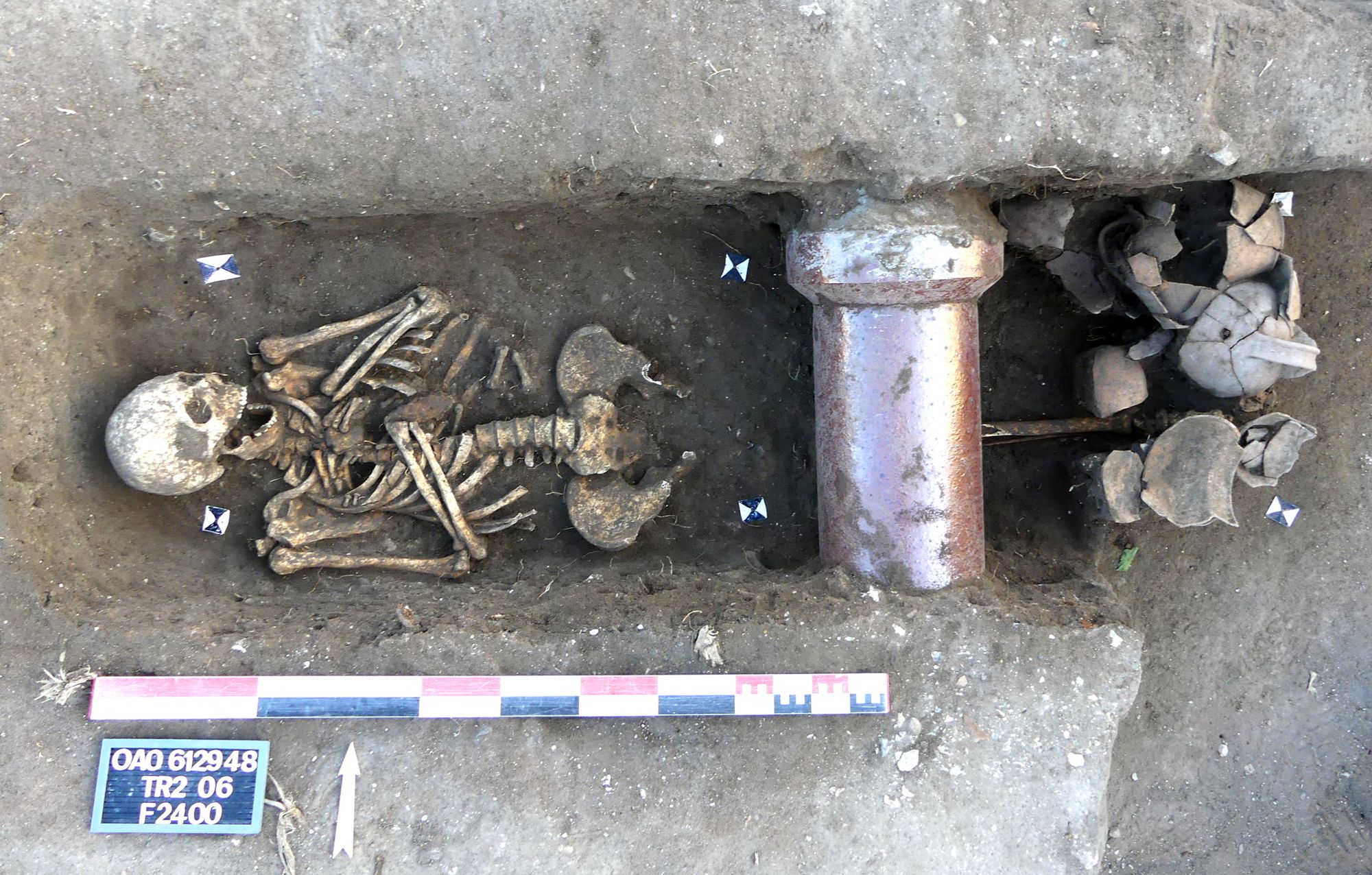 Le plus remarquable pour cette période se situe à une trentaine de mètres plus à l’est : il s’agit d’une nécropole (fin Ier s. de notre ère jusqu’au milieu du IIIe s.) qui se développe à l’ouest d’un mur parcellaire traversant le site du sud-ouest au nord-est. De la sépulture située la plus au sud à celle située la plus au nord, la nécropole s’étend sur une longueur d’au moins 110 m et se poursuit certainement au-delà des limites de fouille. Cet espace funéraire présente des caractéristiques très marquées : uniquement des inhumations disposées en une seule rangée, perpendiculairement au parement ouest du mur parcellaire, uniquement des individus masculins adultes, utilisation systématique de cercueils avec dépôts monétaires et offrandes diverses (céramique, tablettes de défixion avec inscriptions en langue gauloise et latine, etc.). L’interprétation de cette nécropole, encore en cours d’étude, pose question : s’agit-il d’une nécropole urbaine accueillant une corporation particulière ou une catégorie spécifique de population ? Ou alors une nécropole familiale bordant le mur de clôture d’un domaine ?
