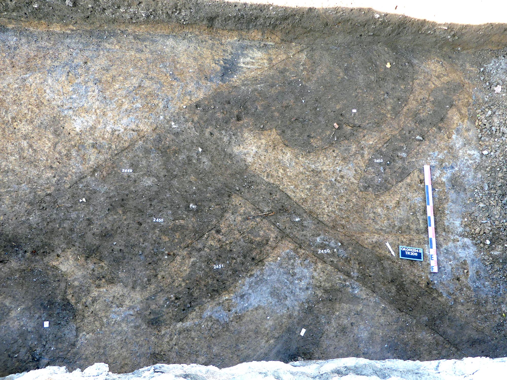 Plus à l’ouest et après abandon de la nécropole, cet espace rural est traversé par un grand fossé (largeur 6 m, profondeur 3 m, profil en V) orienté nord-sud, probablement doublé d’un talus côté oriental. Son comblement a livré du mobilier compris entre le IIIe et le début du Ve s. Il pourrait ainsi s’agir d’un fossé défensif de l’Antiquité tardive, ou d’un repentir de fossé défensif, à mettre peut-être en relation avec la construction de l’enceinte tardo-antique d’Orléans au cours du 3e quart du IVe s.