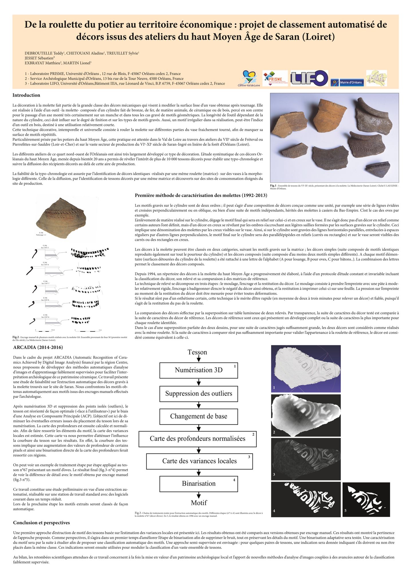 Arcadia est un programme triennal, soutenu par la région Centre-Val de Loire, visant à développer une méthode automatique de reconnaissance et d’appariement des décors à la molette réalisés sur les céramiques du haut Moyen Âge, produites dans les ateliers de Saran (Loiret) et commercialisées sur Orléans.