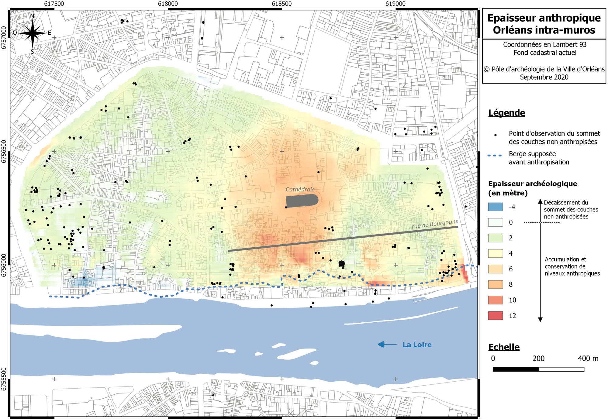 Cette base permet notamment d’évaluer et de modéliser l’épaisseur des couches urbaines d’origine anthropique. Pour Orléans intra-muros, ce sont ainsi plus de 300 points d’observations jugés fiables qui ont été utilisés pour modéliser le sommet des couches non anthropisées.