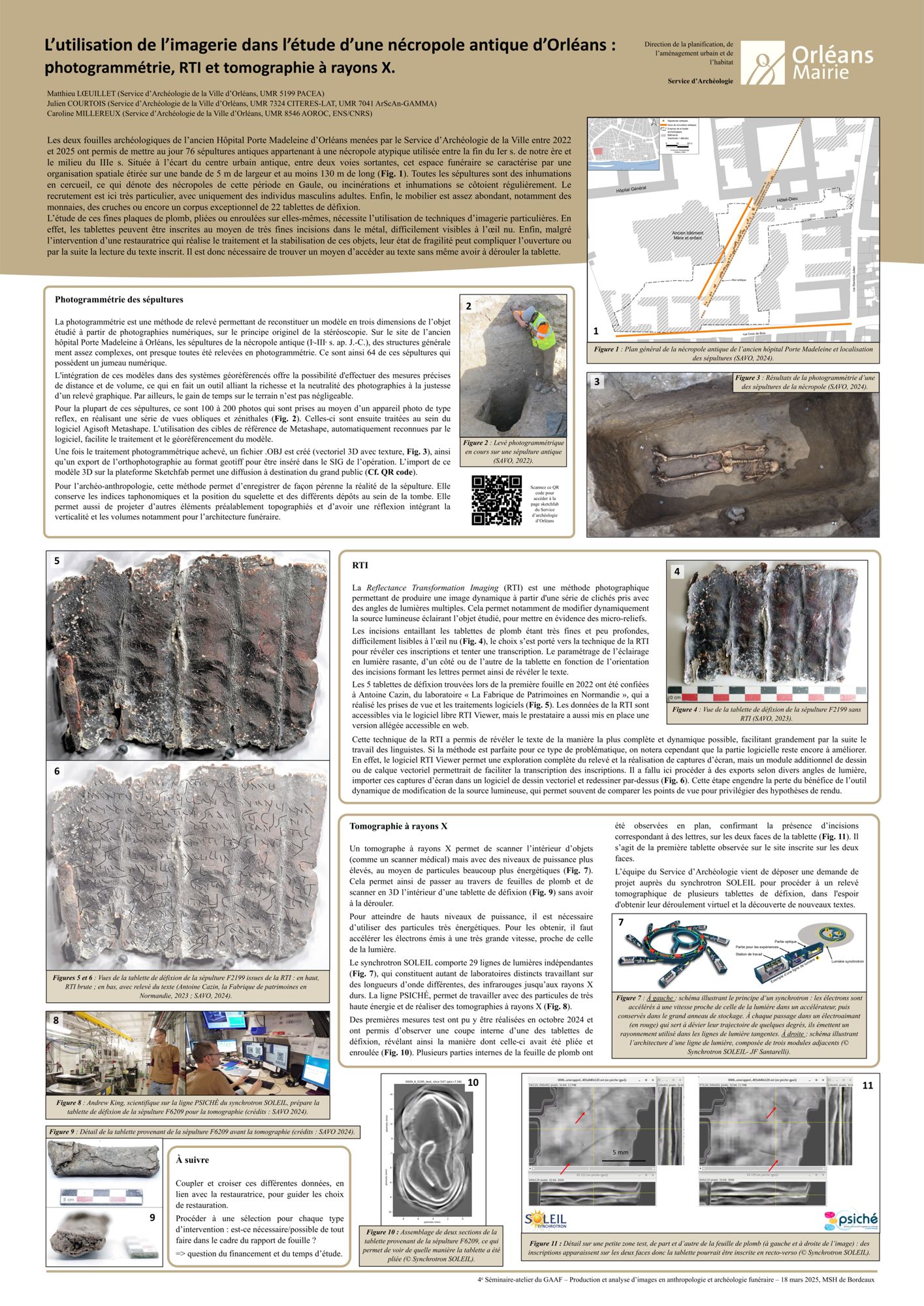 Dans le cadre du 4ème séminaire-atelier du GAAF (Groupe d'anthropologie et d'archéologie funéraire) portant sur la production et l'analyse d'images en anthropologie et archéologie funéraire (18 - 19 mars, Bordeaux), J. Courtois et M. Loeuillet du Service d'archéologie présentent un poster.