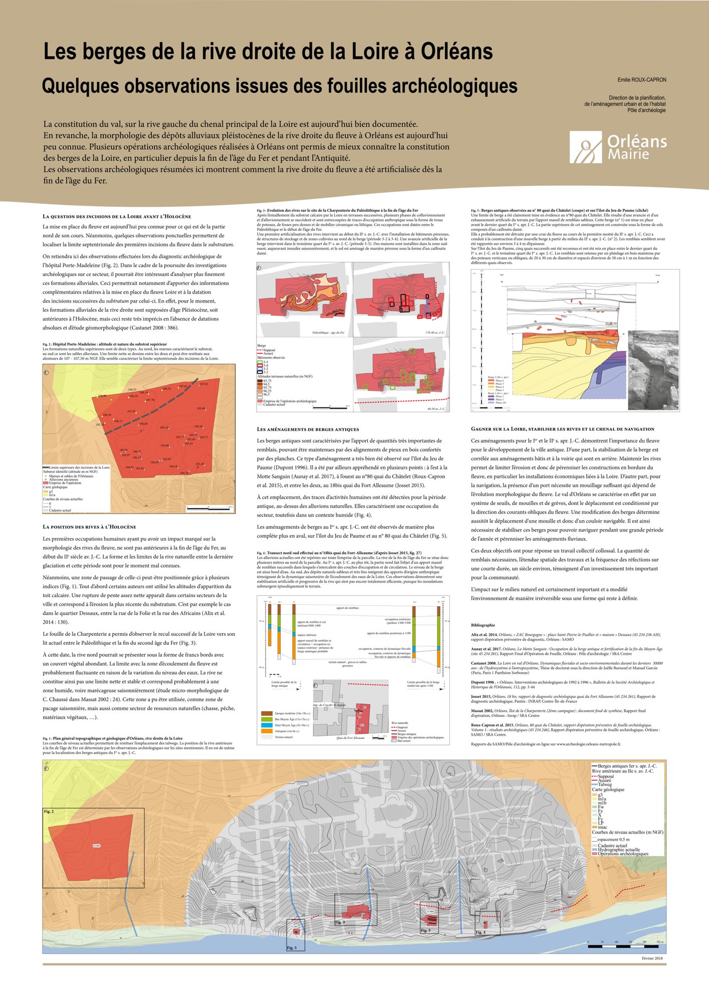 Dès sa création durant le IIe s. av. J.-C., l'agglomération de Cenabum-Orléans se développe le long de la Loire, à la fois comme tête de pont et nœud commercial au sommet de la boucle ligérienne. De nombreux aménagements témoignent de ces relations avec le fleuve durant l'époque romaine. Les opérations archéologiques de ces 25 dernières années permettent de brosser un tableau général de l'organisation des rives du fleuve du IIe s. av. au IIe s. apr. J.-C., entre successions de quais avec entrepôts dénotant une activité marchande intense et simples aménagements liés au renfort des berges. Ces opérations d'aménagement témoignent de l'investissement de la communauté en raison de l'importance de l'activité commerciale et participent à la modification de la topographie urbaine et à l'appropriation du fleuve.
