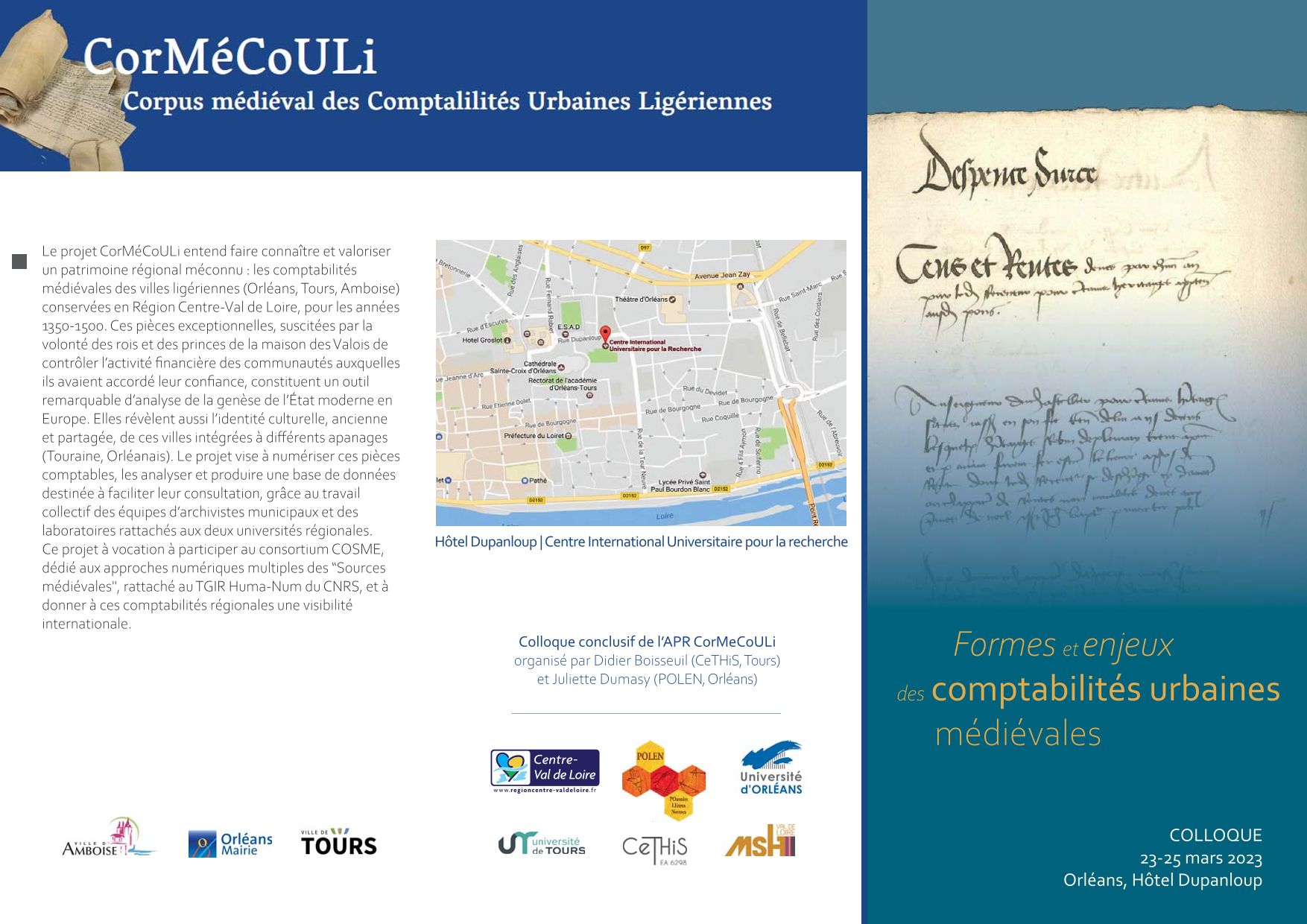 Le projet CorMéCoULi entend faire connaître et valoriser un patrimoine régional méconnu : les comptabilités médiévales des villes ligériennes (Orléans, Tours, Amboise) conservées en Région Centre-Val de Loire, pour les années 1350-1500.