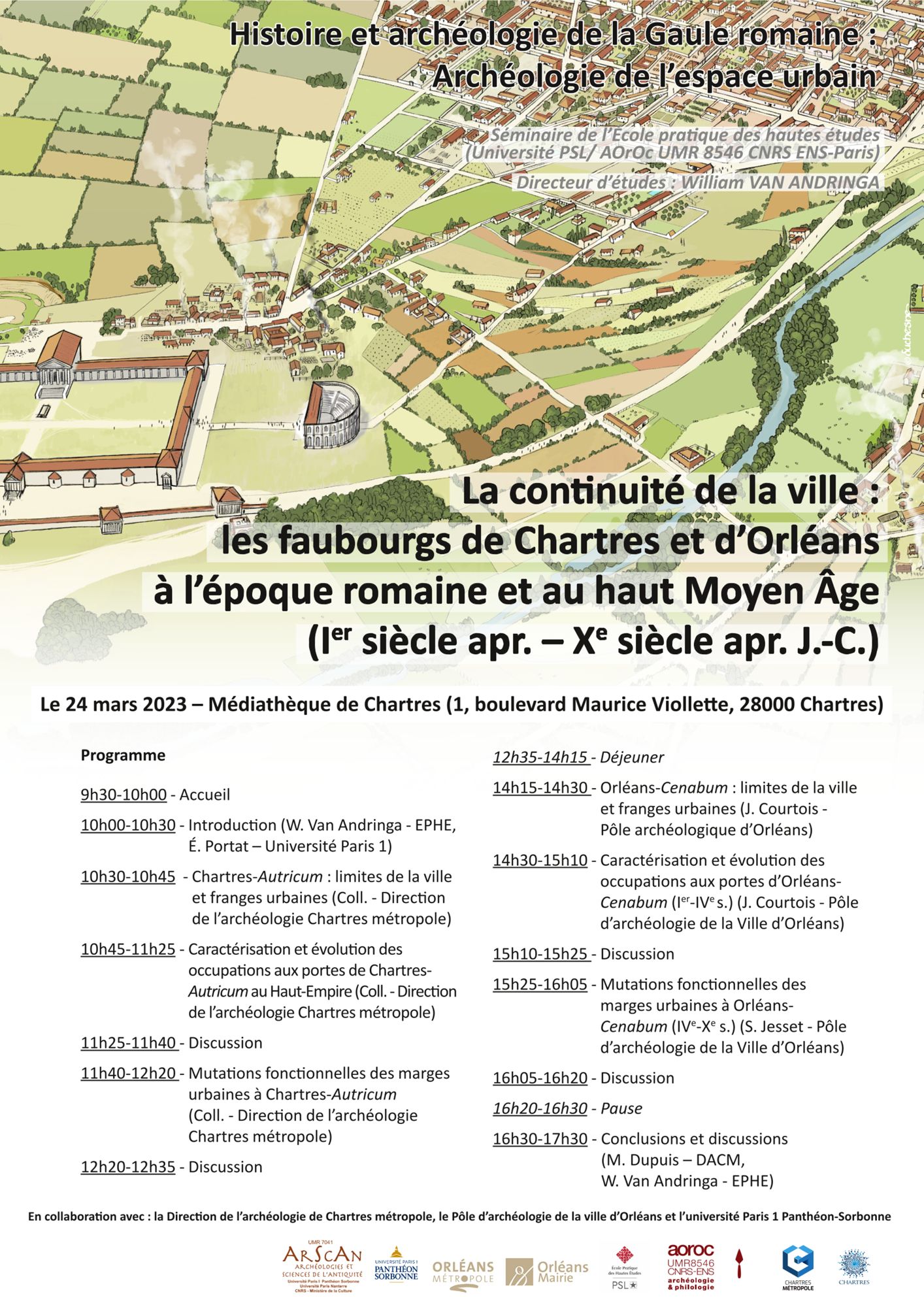 Cette journée de séminaire de l'École Pratique des Hautes Études (Université PSL/AOrOc UMR 8546 CNRS ENS-Paris ; directeur d'études : William Van Andringa) permettra de confronter les connaissances archéologiques des deux villes majeurs du peuple des Carnutes que sont Chartres-Autricum et Orléans-Cenabum, à travers la thématique des faubourgs et des abords de la ville. Cette problématique sera aussi abordée sous le prisme de l'évolution des franges urbaines au cours de l'Antiquité tardive et du haut Moyen Âge.
