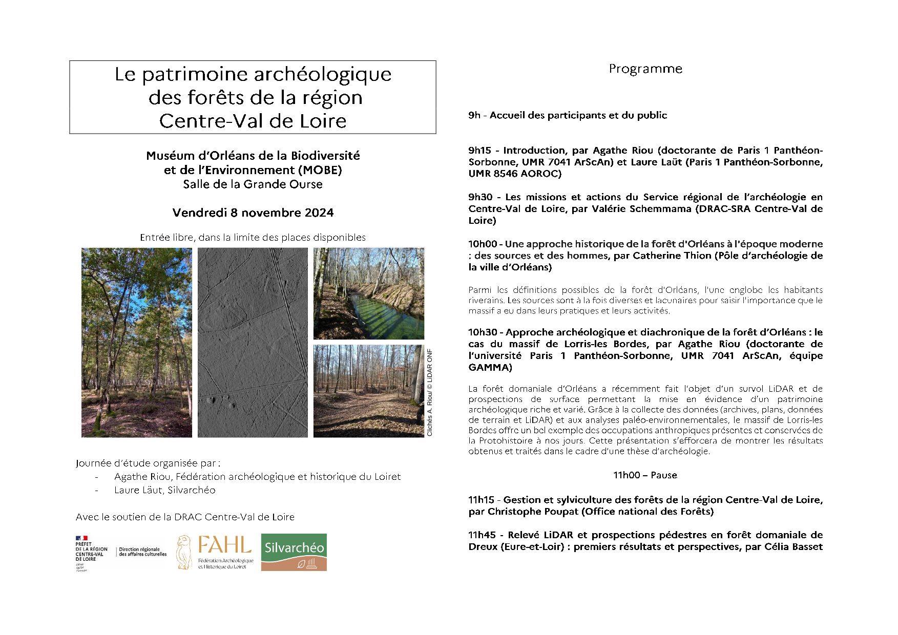 Le 8 novembre 2024, une journée d'étude sur le thème du patrimoine archéologique des forêts de la région Centre-Val de Loire est organisée par A. Riou (Fédération archéologique et historique du Loiret) et L. Läut (Silvarchéo) et se tiendra au Muséum d'Orléans de la Biodiversité et de l'Environnement.