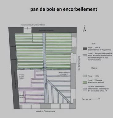 L’analyse des structures charpentées peut concerner aussi bien l’étude du gros-œuvre que du second-œuvre de bâtiments conservés en élévation : murs en pan de bois, charpentes de toit, plafonds, cloisons, etc. Lors de leur relevé et de leur enregistrement une attention particulière est portée aux éléments techniques propres au domaine de la charpenterie (traces de transport, de façonnage et de mise en œuvre du bois, assemblages, marques, remplois, etc.), mais également aux répartitions et aux relations entretenues par ces ossatures de bois avec les autres éléments constitutifs de l’édifice (hourdis, fondations, solins ou bahuts, murs maçonnés, caves voûtées). Ces structures de bois servent parfois de support pour la mise en place d’un décor assurant la mise en valeur du bâtiment (modénatures, sculptures, traitement de l’épiderme). Au-delà de ces aspects constructifs et esthétiques, l’étude des charpentes renseigne certaines problématiques concernant les fonctions, les circulations et les distributions des espaces ou encore sur le statut de leurs commanditaires et de leurs occupants. Les exemples présentés ici proviennent d’études de bâtiments orléanais médiévaux et modernes, principalement des habitations.