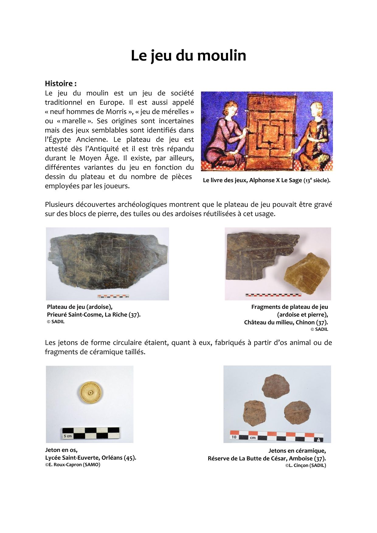 Plusieurs découvertes archéologiques montrent que le plateau de jeu pouvait être gravé sur des blocs de pierre, des tuiles ou des ardoises réutilisées à cet usage.