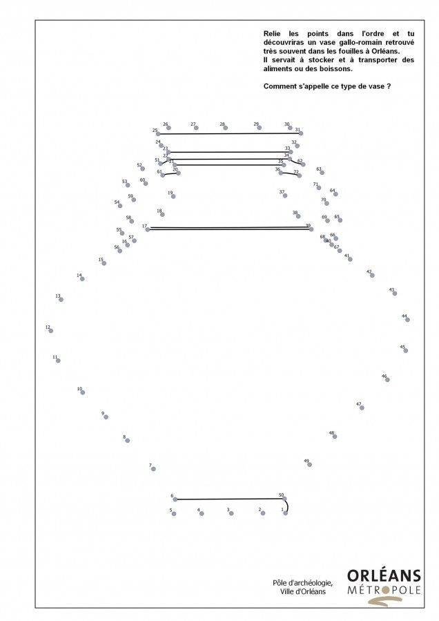 Objet n° 5 Dernière modification : 23 avril 2020 Découvre l'emballage gallo-romain qui se cache derrière les points à relier. A télécharger et imprimer : objet n° 5 (crédits : Pôle d'archéologie, 2020) (149.4 Ko) Clique sur la réponse quand tu auras dessiné.