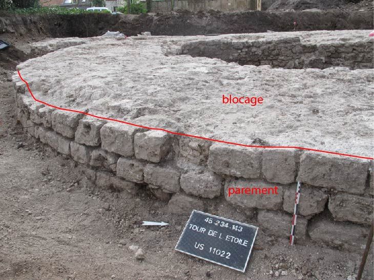 Blocage Tour de l'Etoile, fouille de la Motte Sanguin, Orléans (crédits ; Service d'archéologie, 2014). Cœur d’une maçonnerie, entre les parements, souvent constitué de tout-venant et de mortier.